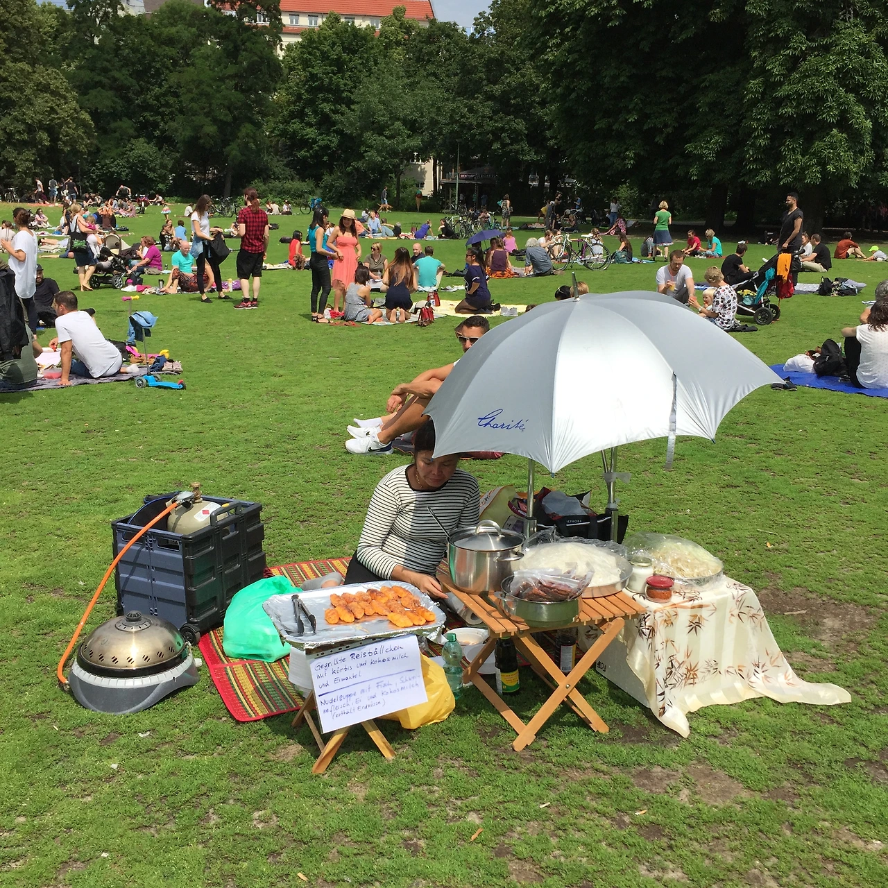 그러던 중 ‘할로 베를린(HALLO BERLIN, 지은이:전세나)'이란 책을 우연히 접하게 됐다. 책에 소개된 베를린 속의 작은 태국에 대한 정보를 봤다. 베를린의 서남쪽에 위치한 프로이센 공원(Preußenpark)에서 만날 수 있는 대규모 야외 음식 재래시장과 같은 곳이다. 4월부터 9월까지 매주 금요일부터 일요일까지 각종 태국 음식 및 베트남 음식을 만나 볼 수 있는데 그 행사의 규모가 생각보다 크다. 주문을 하면 바로 조리를 시작하는 그 신선도는 웬만한 레스토랑보다 낫고, 가격은 아주 싸진 않지만 그래도 신선도와 분위기를 생각하면 비싸진 않은 편이다. 가족단위의 소풍, 데이트하는 연인, 친구들 모임까지 연령대나 사람들의 국적도 아주 다양하다. 난 꽤나 오랜 시간 그 근처에 살았음에도 전혀 모르고 있었는데, 마침 몇 직장동료들과 잡담 중에 몇 번 언급되었던 그 공원이 이 공원이었던 것이다.