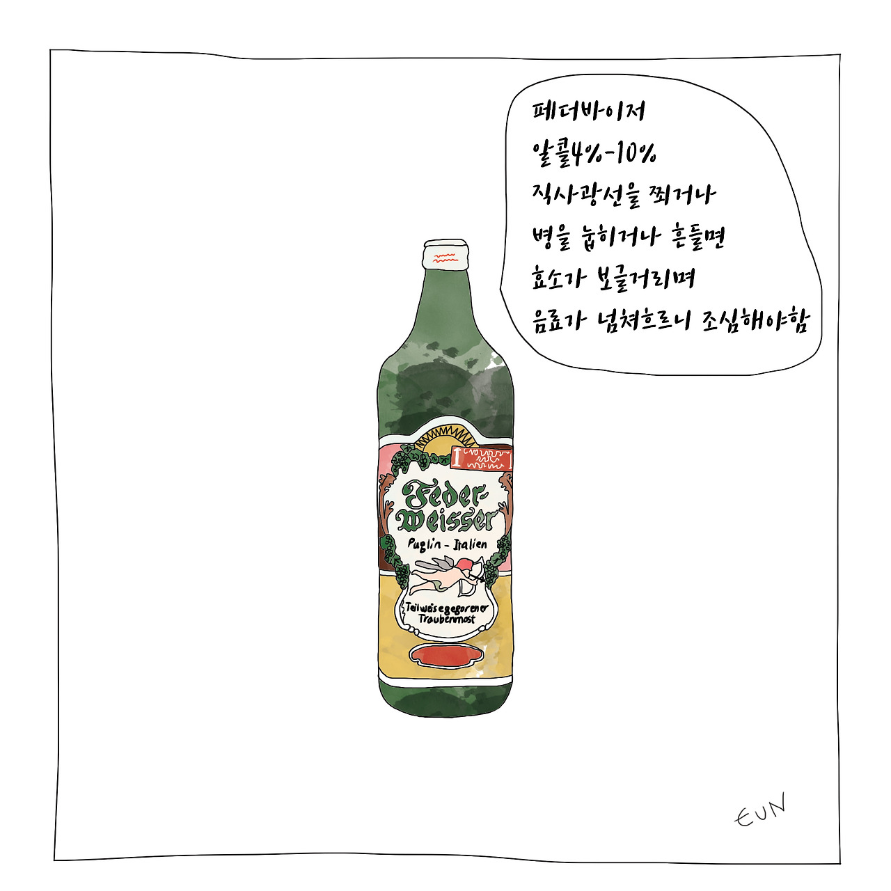 페더바이저 노래를 부르다가 하루는 집 앞 슈퍼마켓에 들어갔더니 냉장고에 떡하니 있었다. 와인과 마찬가지로 레드, 화이트, 로제까지 3종류인데 신나는 마음에 레드를 들고 계산대로 갔다. 아무 생각 없이 가방에 넣는 순간 점원이 뭐라 뭐라 한다. 들어보니(사실 듣기 전에 이미 가방과 계산대는 음료가 새어 나와 난장판이었다) 똑바로 들어야 된다는 것이다. 페더바이저는 천연효소가 함유되어서 직사광선을 쬐거나 병이 많이 흔들리면 스스로 발효되어 병이 터질 수 있다고 한다.