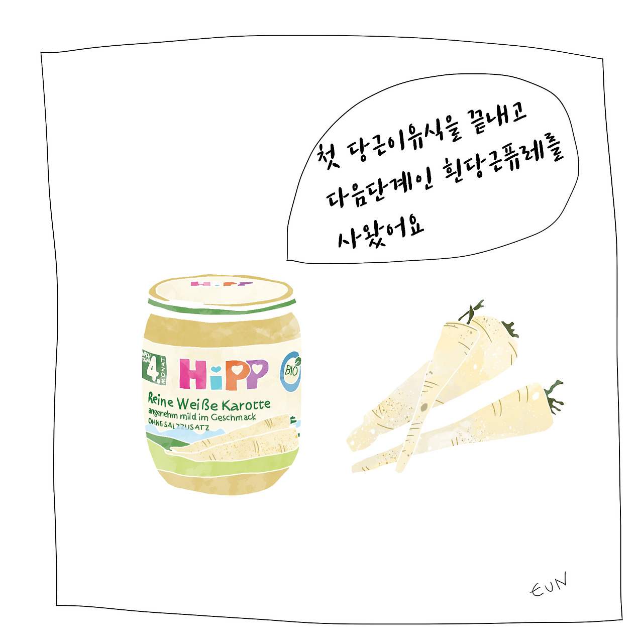 마침 힙(Hipp)에서 받은 당근 퓨레 샘플이 있었고 아기는 무난하게, 그리고 생각보다 잘 먹어주었다.