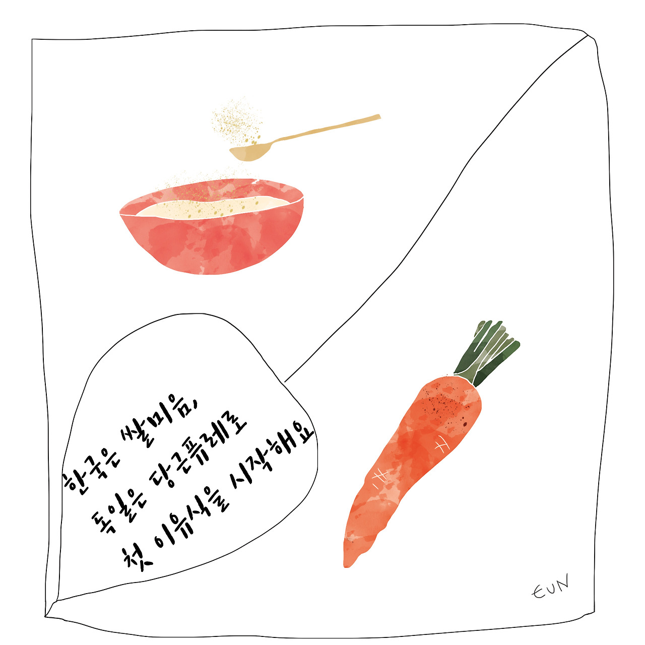한국은 쌀미음부터 시작하지만 독일은 쌀이 주식이 아니어서 그런지 야채나 과일을 한 가지씩 퓨레로 준다.