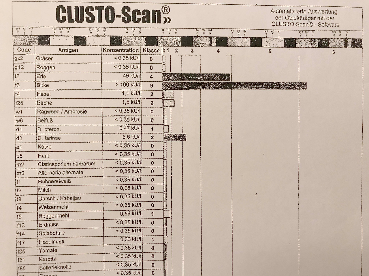 가장 격하게 반응한 물질은 자작나무(Birke), 오리나무(Erle, 자작나무과) 그리고 진먼지 진드기(D.farinae)였다. 자작나무는 일단 저가 가구에 꽤나 많이 쓰이는 재료다. 그 뒤로 나무의 재질도 유심히 보게 됐는데 생각보다 일상에, 주변에 이 나무로 되어 있는 가구들이 흔하다. 그리고 그 외에도 개암나무(Hasel), 물푸레나무(Esche) 등이 있는데 개암나무 열매는 과자 등에 많이 쓰이는 헤이즐넛이고 물푸레나무는 고급 가구에 많이 쓰이는, 진한 색깔이 멋진 재료다.