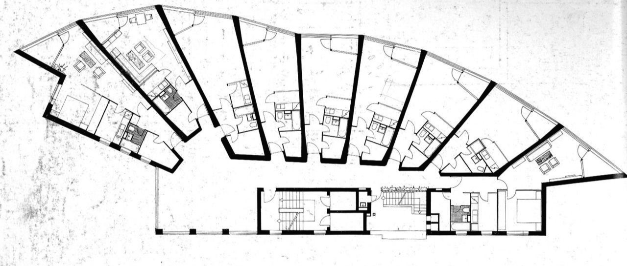맨 왼쪽의 두 세대에는 가구 배치를 표본으로 해 놓았는데, 아마도 예각이 많은 형태라 가구 배치의 불편함을 상쇄하기 위한 도움이었을 것이다. 결과적으로 다양한 크기의 많은 세대가 탄생했다. 1960년대 개발의 속도를 박차던 유럽의 정신에 충실한 계획이다.