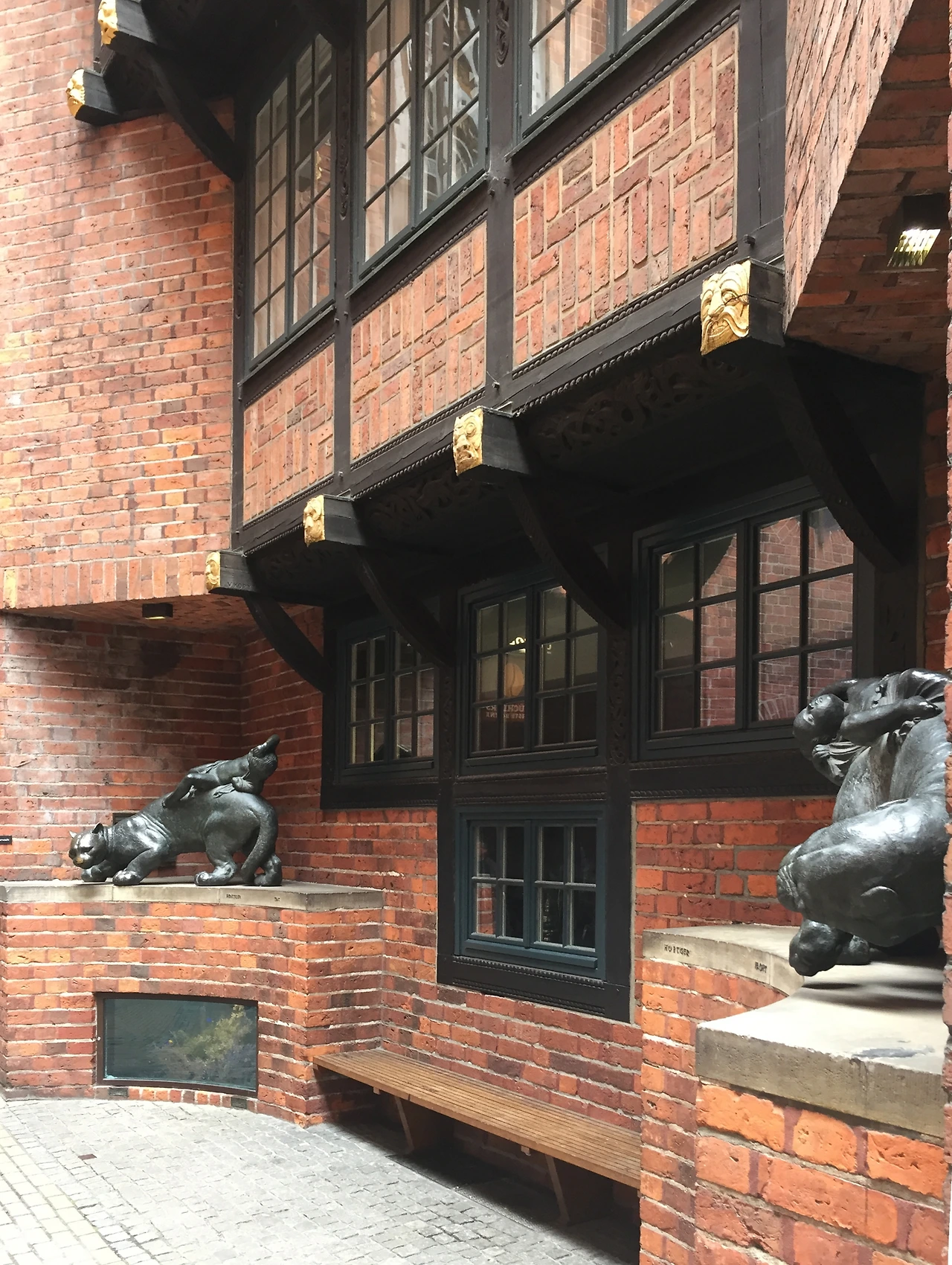 위 사진의 어깨너머의 교회처럼 이 건물도 조적식 입면이다. 하나씩 쌓아 올린 듯한 벽돌 입면은 브레멘 구도심이라는 건물의 위치를 고려하면 자연스럽고 또 당연한 선택이다. 대신 쌓아 올리는 방식으로 곡선도 만들고 아치도 만들고 요철도 만들었다. 기존 이웃 건물들과 연계성을 가지지만 지루해지지 않으려 노력한 점이 멋있다.