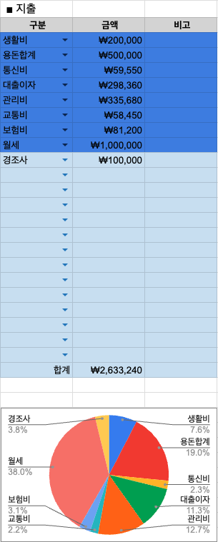부부부의 2024년 03월 지출 내역이다. 파란색은 고정 지출, 하늘색은 추가 지출이다. 엄밀히는 생활비 및 용돈합계(남편 30/아내 20)는 소비 내역이다. 절약을 주제로 이야기하고 있지만, 둘이서 숨만 쉬어도 나가는 금액이 250만 원 정도로 보이고 있다. 절약하는 삶이 맞는가? 의심할 수 있다. 현재 전체 지출의 60% 이상은 주거 비용에서 발생한다. 하지만 이는 월 소득 대비 12~15% 수준이다. 직접적인 소비 항목인 생활비 및 용돈은 월 소득 대비 5~7% 수준이다. 결과적으로 총지출은 월 소득 대비 20~25% 수준이다. 나머지 75~80%는 저축, 노후대비 또는 투자에 활용하고 있다. 그래서 적당한 지출이라 생각한다. 소비 관련 글에서도 언급한 바 있다. 소비는 가치에 맞게 지출하면 된다. 그리고 여력에 맞게 사용하면 된다. 지출 금액은 가치관에 맞게 소득을 고려해서 잘 세팅해야 한다.