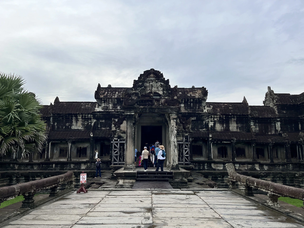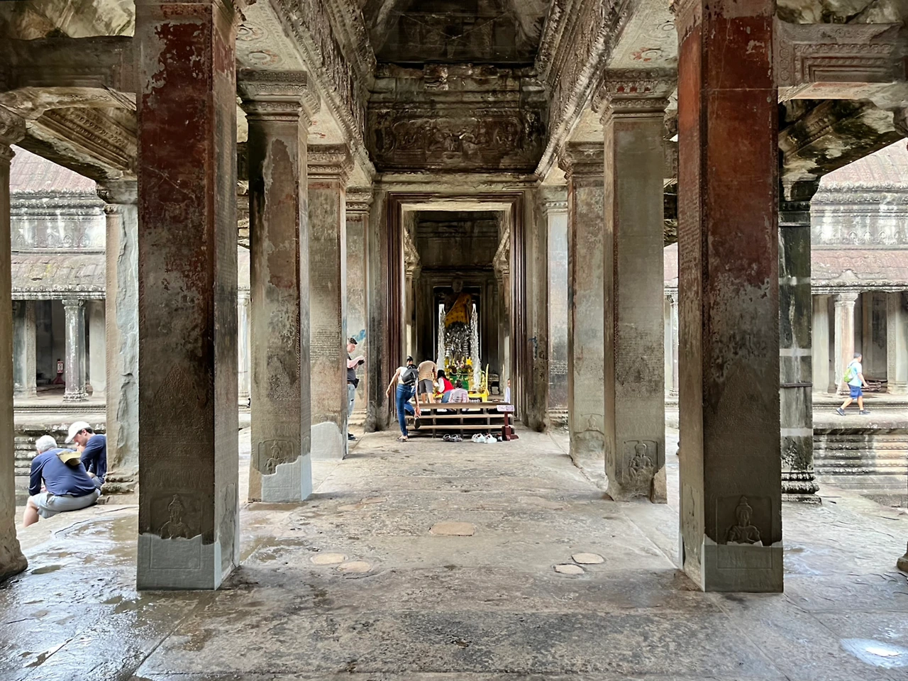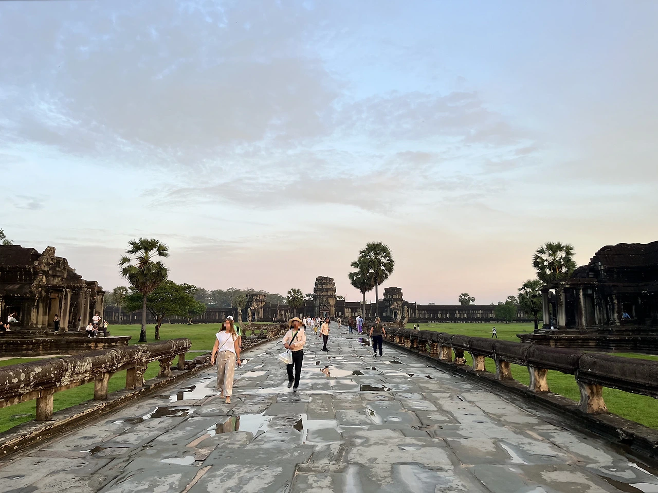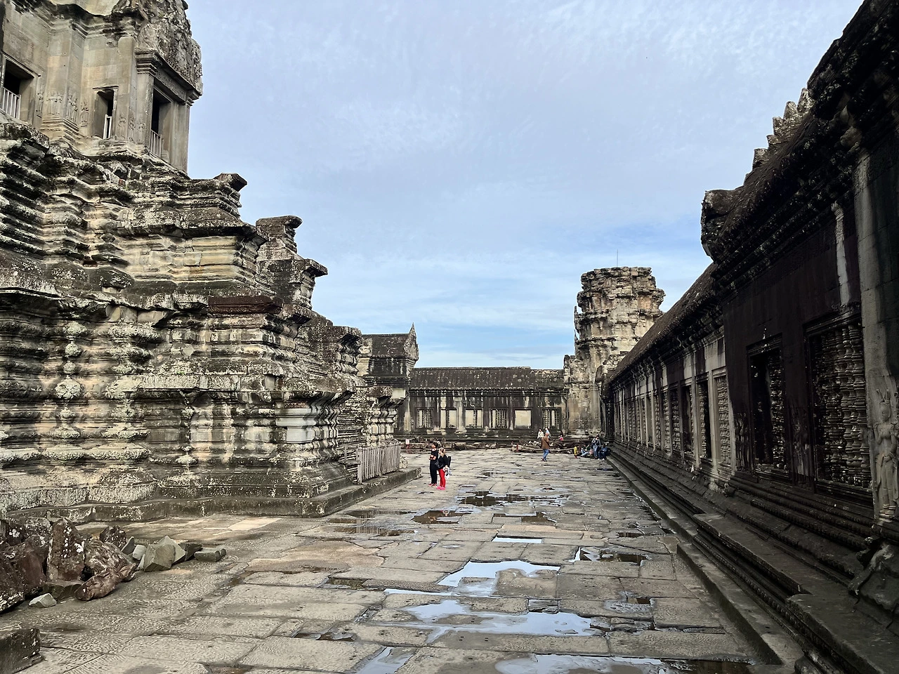 눈에 들어오는 수많은 정보를 미처 다 처리하지 못하고 얼떨결에 서쪽 정문을 나와 사원 내부로 진입했다. 어둡고 습한 석조 건물에서 밝은 실외로 나오니 조금 전 일출 보러 가는 길에 걸었던 석조로 된 긴 보도가, 앙코르 와트의 중앙사원의 1층 회랑까지 일자로 쭉 이어져 있었다.(왕의 길이라고도 부르는 이 석조 보도의 길이는 350m라고 한다.) 멀리 보이는 1층 회랑 뒤편으로 앙코르 와트 하면 떠오르는 웅장하고 우아한 모양의 고푸라들이 다시 나를 반겨주고 있었다. 이 아름다운 사원의 정면을 한눈에 담고 있자니 지금이 비현실적으로 다가왔다. 이 공간에 있은 지도 벌써 한 시간이 훌쩍 넘었지만 아직까지 제대로 실감이 나지 않았던 것이다. 약간 멍한 상태로 1층 회랑을 향해 걸어가다 길 위 곳곳에 있는 물웅덩이 중 하나에 발을 빠뜨려 양말과 샌들이 완전히 젖기도 했다.