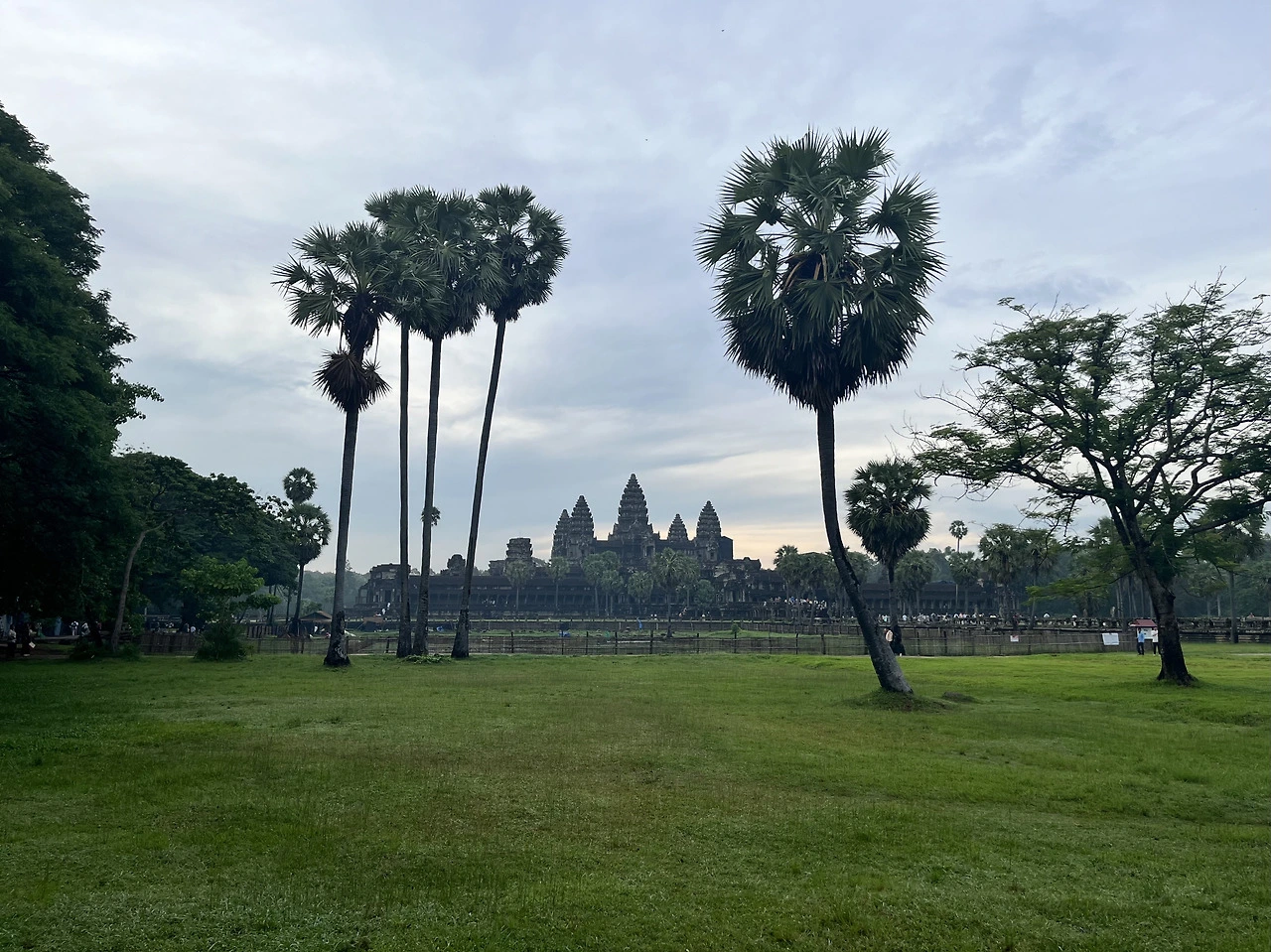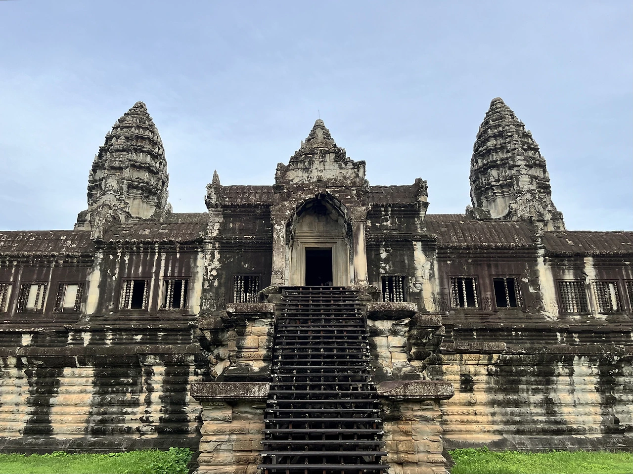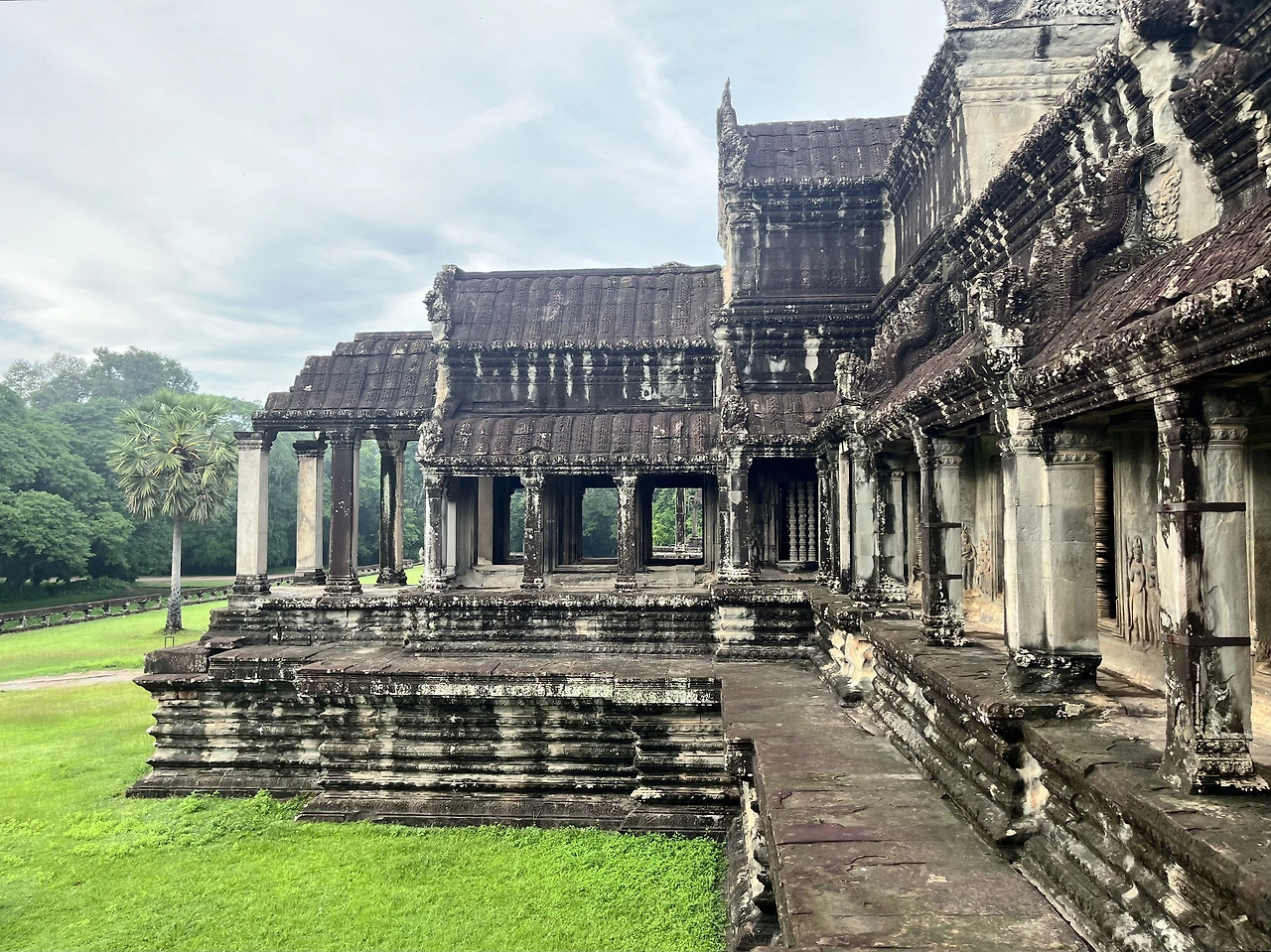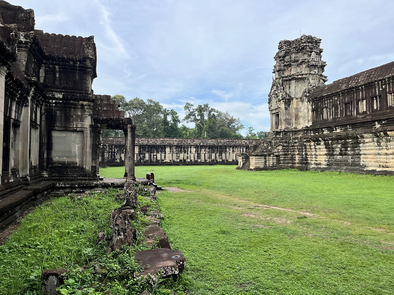 눈에 들어오는 수많은 정보를 미처 다 처리하지 못하고 얼떨결에 서쪽 정문을 나와 사원 내부로 진입했다. 어둡고 습한 석조 건물에서 밝은 실외로 나오니 조금 전 일출 보러 가는 길에 걸었던 석조로 된 긴 보도가, 앙코르 와트의 중앙사원의 1층 회랑까지 일자로 쭉 이어져 있었다.(왕의 길이라고도 부르는 이 석조 보도의 길이는 350m라고 한다.) 멀리 보이는 1층 회랑 뒤편으로 앙코르 와트 하면 떠오르는 웅장하고 우아한 모양의 고푸라들이 다시 나를 반겨주고 있었다. 이 아름다운 사원의 정면을 한눈에 담고 있자니 지금이 비현실적으로 다가왔다. 이 공간에 있은 지도 벌써 한 시간이 훌쩍 넘었지만 아직까지 제대로 실감이 나지 않았던 것이다. 약간 멍한 상태로 1층 회랑을 향해 걸어가다 길 위 곳곳에 있는 물웅덩이 중 하나에 발을 빠뜨려 양말과 샌들이 완전히 젖기도 했다.