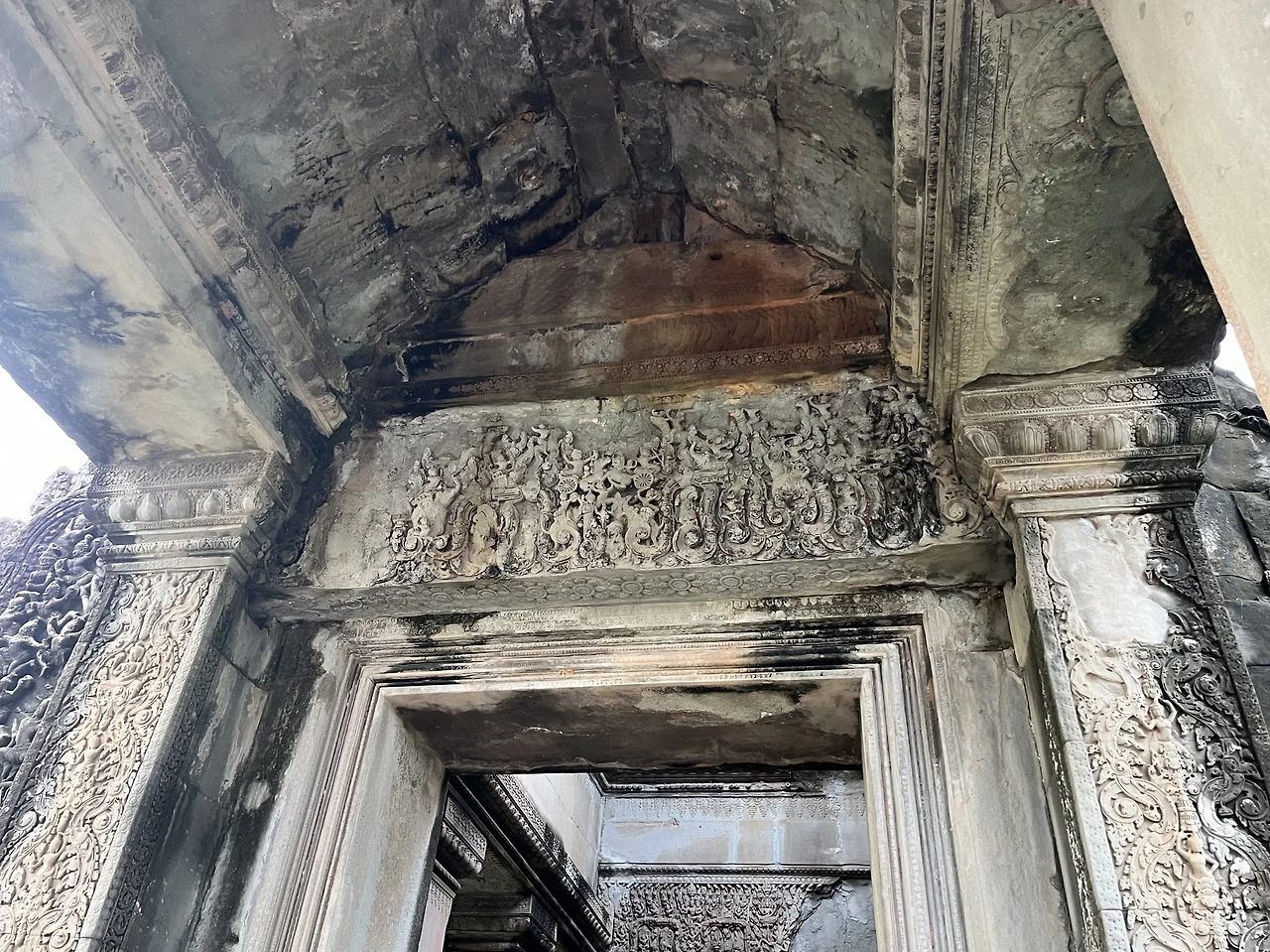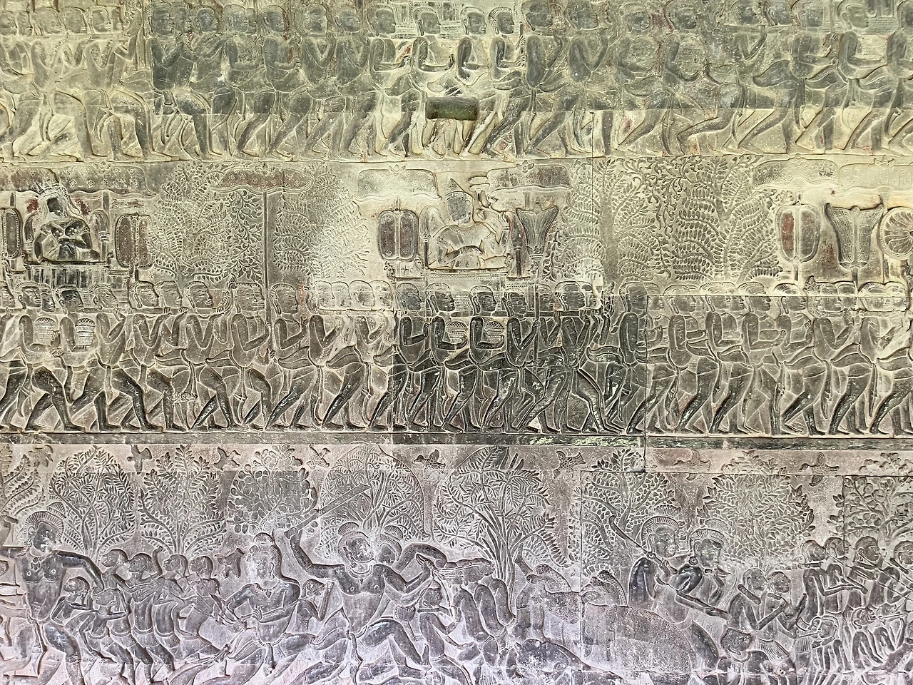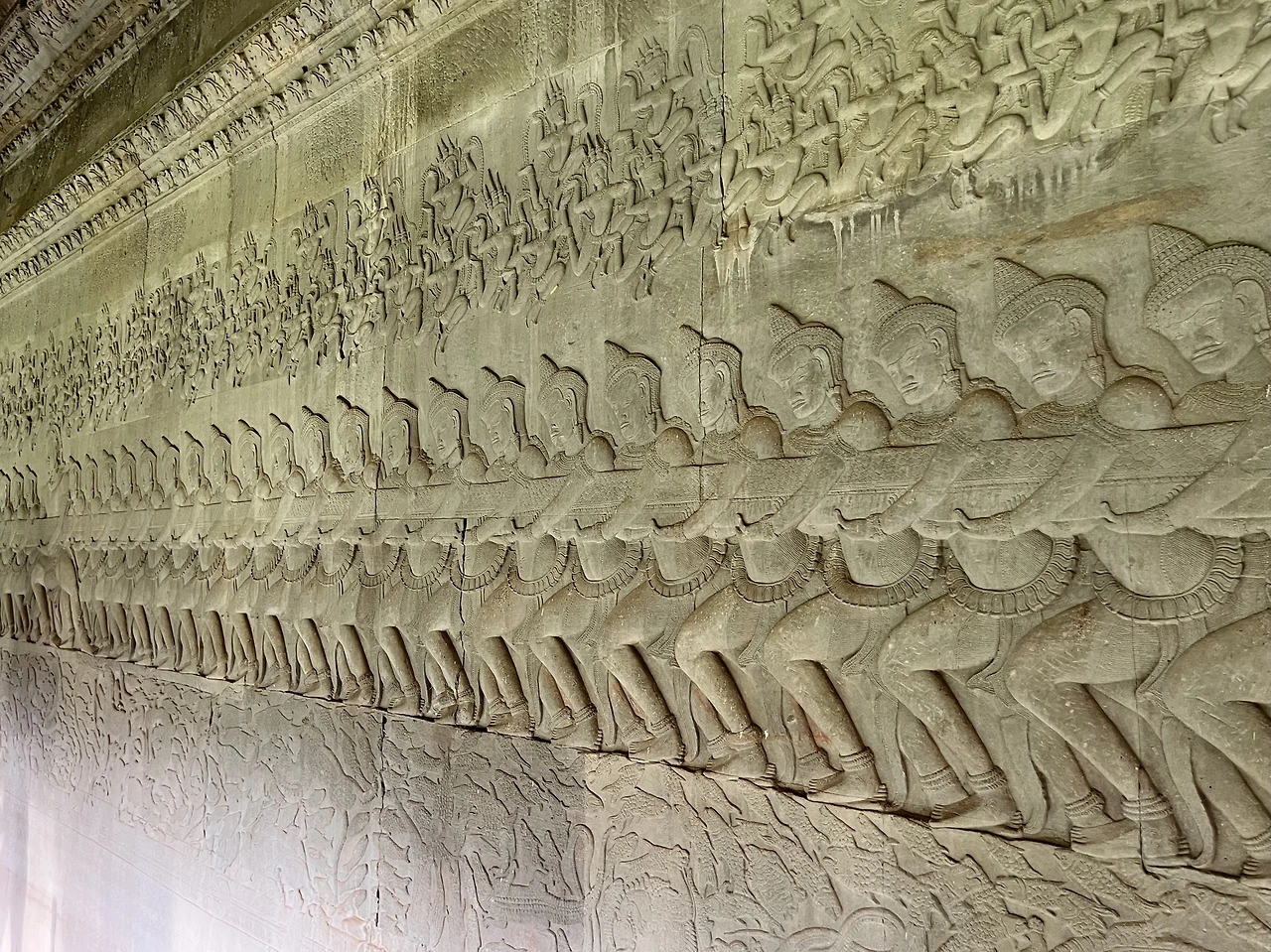 드디어 왕의 길 끝자락에 있는 1층 회랑의 서편 입구에 다다랐다. 위에서 봤을 때 사각형 모양의 이 회랑은 높이 2m, 가로 215m, 세로 187m의 규모를 자랑하는데, 사각형의 네 면이 힌두교 관련 내용이나 전설, 크메르 왕국의 전쟁을 묘사한 부조로 가득 새겨져 있었다. 벽면을 빡빡하게 채운 어마어마한 양의 부조들을 보고 있자니 경이로움과 동시에 어떻게 이걸 다 봐야 할까 하는 막막함도 느껴졌다. 이들 부조의 방대함과 세밀함, 높은 표현력과 예술성에 대해선 나 같은 사람이 설명할 것이 못돼 차마 적지 못하겠다. 혹시나 자세한 내용이 궁금하다면 전문적으로 잘 설명한 글이나 유튜브 영상이 이미 많이 있으니 찾아보시면 될 것 같다. 안타깝지만 사실 나는 설명문은 읽는 것 외엔, 눈으로 보이는 부조의 내용에 대해선 거의 이해하지 못했다.