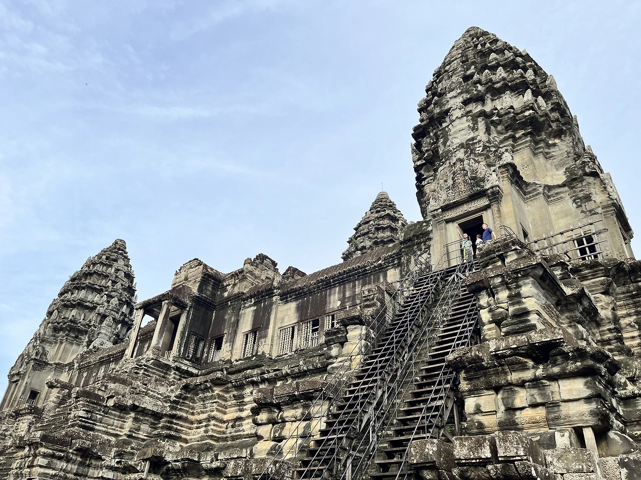 이제 2층으로 올라갈 차례였다. 1층 회랑에서 2층 회랑으로 이동하는 길에, 그 둘을 연결해 주는 중간단이라고 불리는 밭전자 모양의 십자회랑이 있었는데 앙코르 와트 스타일의 특이한 건축 양식이라는 설명이 있었다. 중간단을 지나 2층 회랑으로 천천히 올라갔다. 2층 회랑은 1층 회랑의 절반 정도 되는 크기에, 벽면에는 1층과 같은 빽빽한 부조 대신 힌두 신화 속 천상의 무희라는 압사라들의 아름다운 춤사위가 새겨져 있었다. 가벼운 마음으로 압사라 조각과 창문으로 보이는 캄보디아의 푸른 숲을 감상하며 2층 회랑을 한 바퀴 돌고, 회랑 가운데 있는 3층의 중앙성소로 올라가는 입구 쪽으로 향했다.