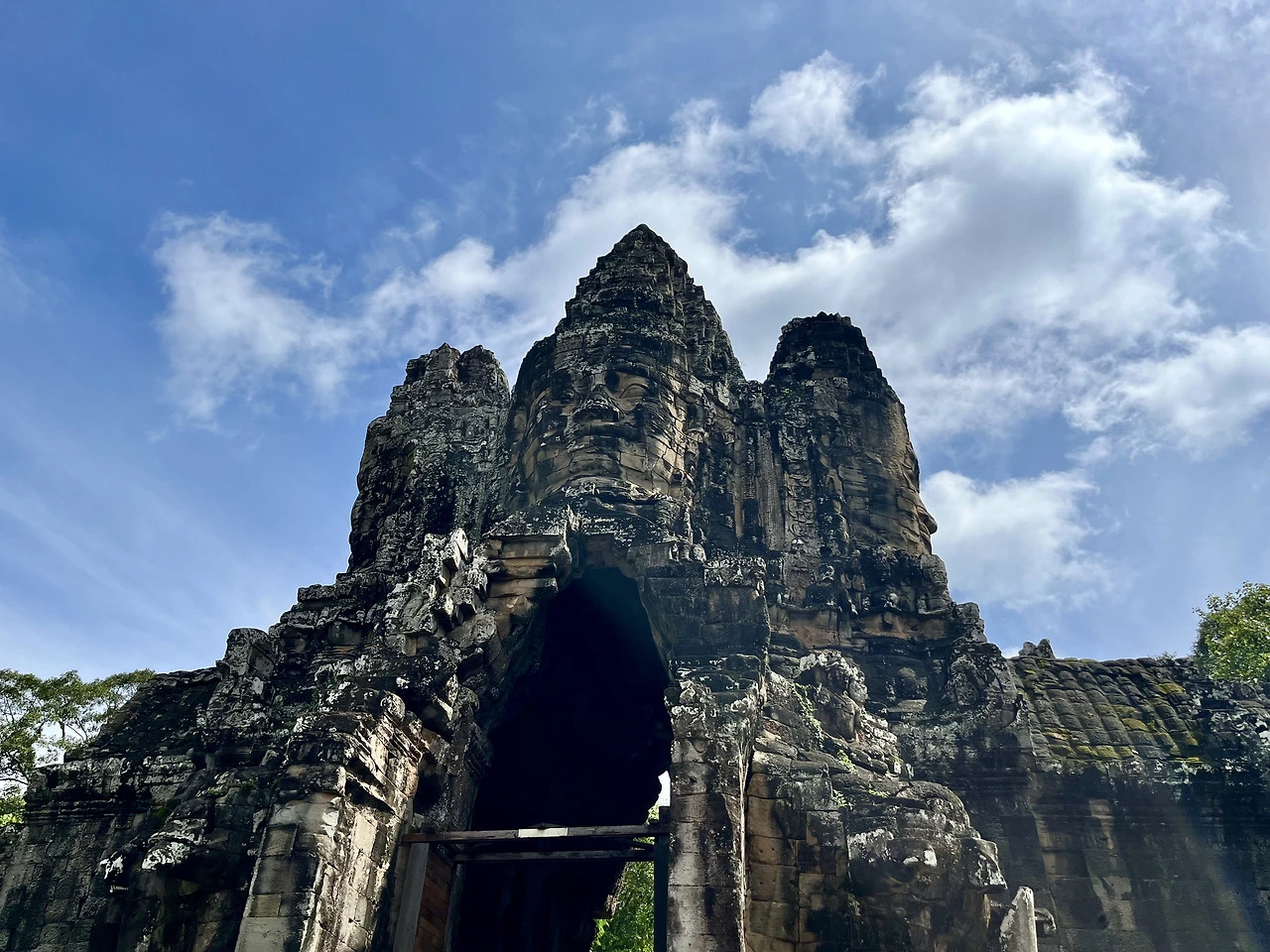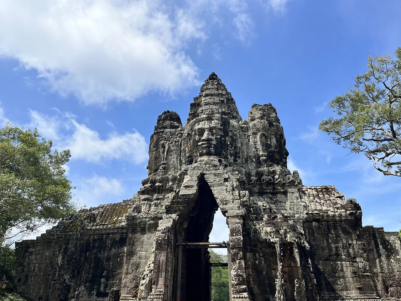성벽을 둘러싼 작은 해자와 그 위에 놓인 다리를 건너 앙코르 톰 남문 앞에 도착했다. 다리의 좌우 난간에는 엄청난 수의 석상들이 일렬로 배치되어 있었는데 이 광경부터가 굉장히 인상적이었다. 난간 위의 석상 뒤로 보이는 해자와 나무, 푸른 하늘의 풍경도 열대지방에서 볼 수 있는 특유의 그 아름다움이 있었다. 하지만 뒤이어 네 면이 관음살의 얼굴로 조각된 지붕이 올려져 있는 남문을 가까이서 볼 때, 방금 본 다리의 난간은 시작에 불과했구나란 생각을 들었다. 네 얼굴의 조각상을 찬찬히 바라보고 있자니, 그 얼굴의 미소에 보는 사람으로 하여금 쉽게 눈을 뗄 수 없게 만드는 마력이 깃들어 있는 것 같았다. 크메르 왕국의 최전성기 시절 왕국의 수도로서 기능했던 도시이자 요새인 앙코르 톰, 그곳을 지키는 네 개의 정문 중 한 곳다운 웅장함과 만듦새에 감탄을 연발하며 다리와 남문의 사진을 여러 장 남겼다. 그리고 남문을 통과해 요새의 중앙에 있는 바이욘 사원까지 일자로 쭉 나있는 길을 따라 걸어갔다.