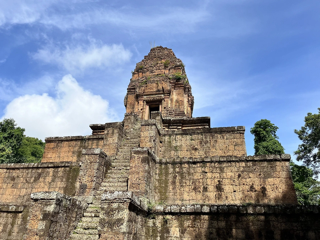 앙코르 톰을 방문하기 이전에, 앙코르 톰 남문 바로 아래에 있는 박세이 참크롱(Baksei Chamkrong)이라는 작은 사원 앞에 내렸다. 앙코르 톰에서 그리 멀지 않은 위치이고, 유적지 사전 조사 때 참고했던 사이트의 추천 목록에도 있기에 이곳에서 오늘의 첫 탐방을 일정을 시작하기로 했다. 툭툭에서 내리자마자 사원 방향으로 고개를 돌리니 나무에 살짝 가려진 사원의 모습이 보였다. 조금 걸어 들어가니 사원의 전체 모습을 볼 수 있었는데, 전날 방문했던 앙코르 와트를 제외한 첫 앙코르 유적 구경이기도 했고, 체력도 풀충전 상태라 그런지 기대했던 것보다 더 아름답고 웅장해 보였다.