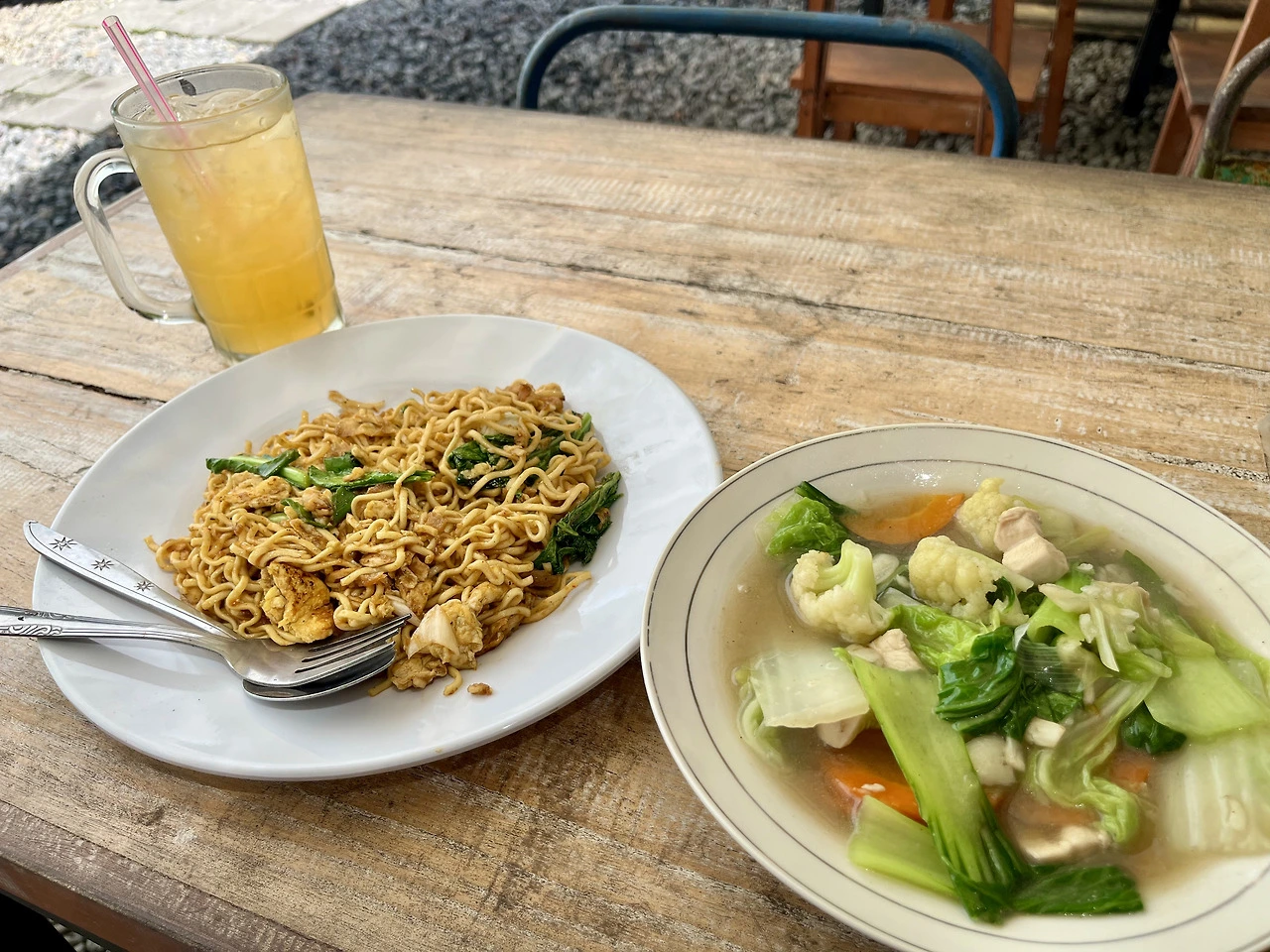 꾸따식 호객에 약간의 피곤함을 느끼며 와룽에 도착했다. 전날 나시 고렝은 경험해 봤으니, 오늘은 미 고렝을 먹어볼 생각이었다. 배가 고파서 곁들여 먹을 음식으로 야채와 닭고기를 넣고 끓인 국인 짭짜이(Capcai)도 함께 주문했다. 처음엔 Capcai를 어떻게 발음해야 할지 몰라서 캡카이라고 했는데, 음식이 제대로 나온 걸 보니 다행히 잘 전달된 모양이었다. 특별한 맛이라 하긴 어려워도 두 음식 모두 적당히 짭짤한 간도 좋았고, 면과 야채의 익힘 정도도 적절해서 마지막까지 맛나게 먹을 수 있었다. 더운 날 야외에서 뜨거운 국을 먹느라 예상치 못한 땀을 빼긴 했지만 과히 나쁜 기분은 아니었다. 오늘의 식사비는 35K 루피아(약 3,000원). "뜨리마 까시!" 인사로 감사의 마음을 전달하고 와룽을 나왔다. 이 인사말도 몇 번 해보는 사이에 조금 익숙해진 듯했다.
