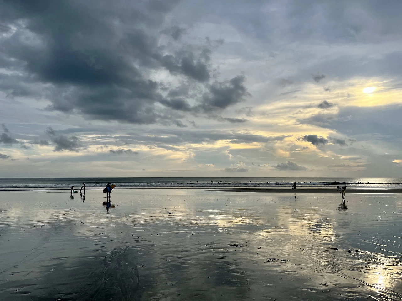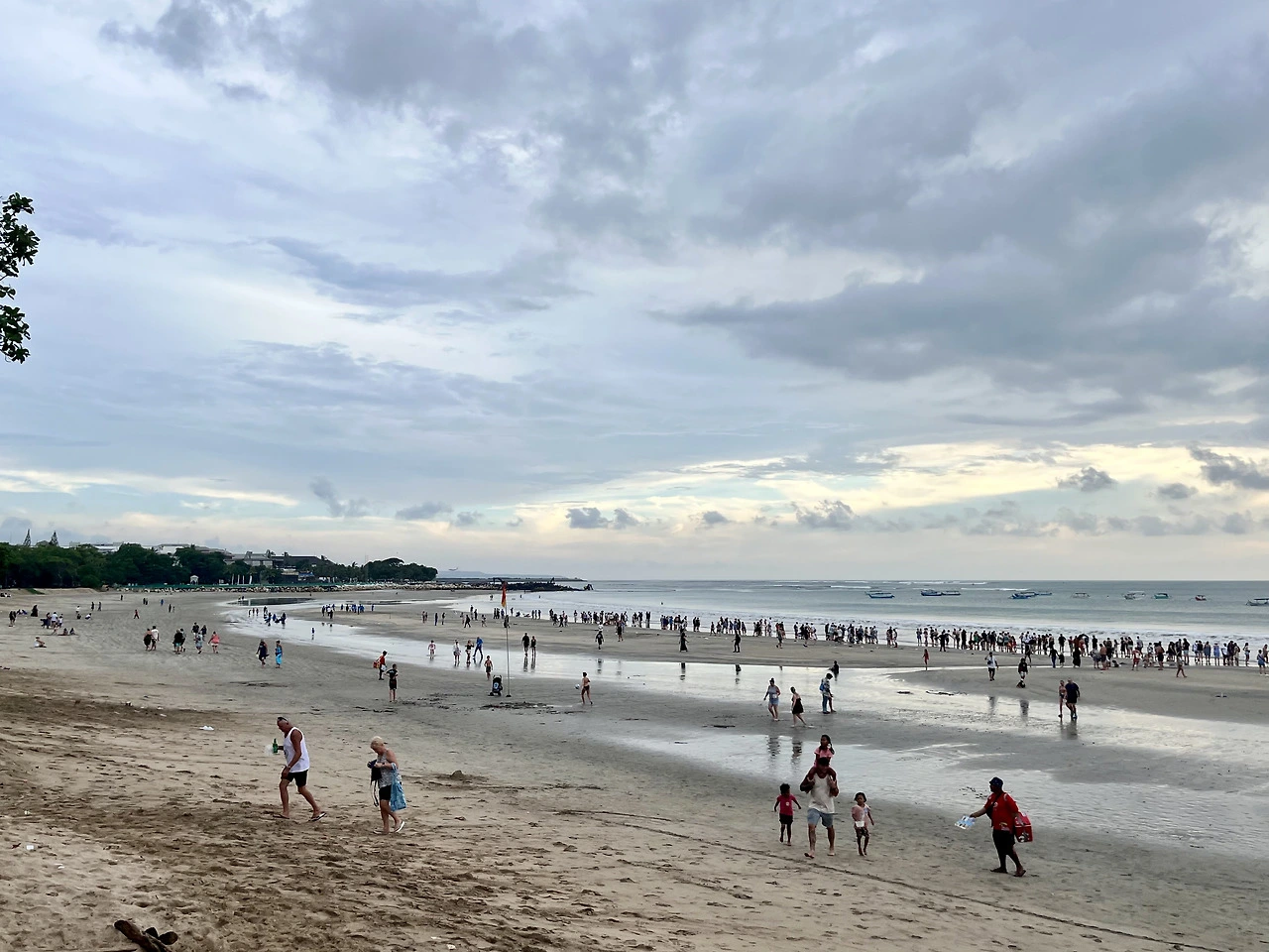 하루 중 해 질 무렵의 시간을 가장 좋아하는 나이기에, 발리의 바다로 떨어지는 해를 보기 위해 다시 해변으로 돌아왔다. 하늘을 보니 구름이 수평선 부근까지 내려와 있어서 제대로 된 일몰은 보기 힘들 것 같았다. 그래도 노을 지기 전 꾸따 해변의 풍경은 감탄을 자아내기에 충분했다. 간조 때라 바닷물이 빠진 공간을 남은 바닷물에 적셔진 모래가 대신하고 있었는데, 그것이 하늘과 구름의 빛깔을 은은하게 반사해 주고 있었다. 멀리 모래 위를 걷는 사람이 마치 하늘 위를 떠다니는 듯, 사진에서만 봤던 우유니 사막을 앞에 두고 있는 듯 황홀한 광경이었다. 나도 신발을 벗고 촉촉한 모래 위를 걸으며 하늘을 걷는 상상을 해본다.