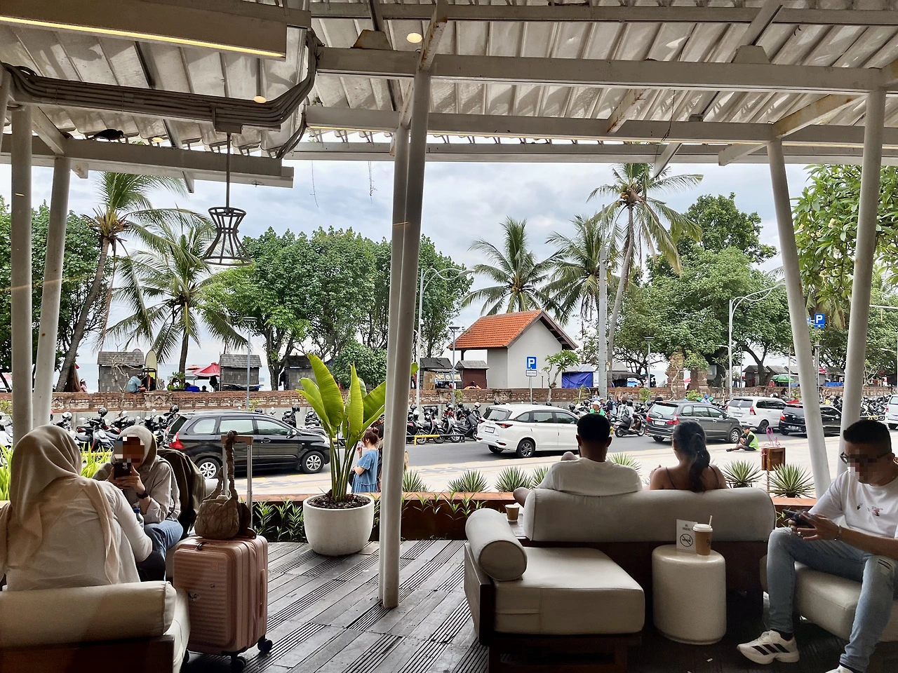 바닷바람과 함께 느린 발걸음으로 레기안 해변을 거쳐 꾸따 해변까지 내려왔다. 오늘 오전 와룽 가는 길에 외관이 괜찮아 보이는 카페를 발견하고 구글 지도에 저장해 두었다. 마침 그곳 위치도 꾸따 해변 근처라 잠시 들렀다 가기로 했다. 방문한 카페는 꾸따 비치워크 몰에 입점해 있는 퍼센트 아라비카로, 한국에선 응 커피라고 부르는 곳이다. 깔끔하고 세련된 인테리어에 입지도 좋아서, 카페 내부와 바깥 구경하며 쉬기 알맞은 곳이었다. 커피 맛은 글쎄. 아이스 아메리카노를 마셨는데 어떤 맛인지 기억이 나질 않는다. 창가 자리가 나길 잠시 기다리다 마음에 드는 자리를 잡았다. 커피를 홀짝이며 앞으로의 여행 계획도 세워 보고, 이번 여행기 프롤로그도 다듬어 보고, 지나다니는 사람 구경도 하다 보니 어느새 일몰 시간이 다가와 있었다.