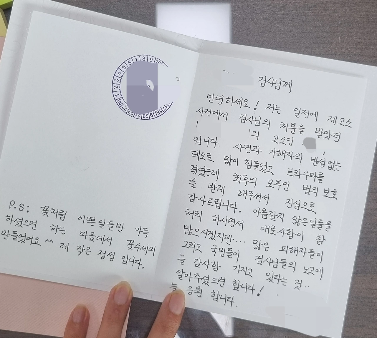 아쉽게도 수세미는 피해자에게 ‘마음만 받겠다’는 쪽지와 함께 반환되었다. 김영란법 시행 이후 사건과 관련해서는 음료수 하나도 받을 수 없게 되었기 때문이다. 나는 카드라도 돌려달라고 해서 소중히 간직하고 있다. 검사 게시판에도 '00 지검 **검사가 수세미와 편지를 받았다'는 내용의 글이 올라가 10년간 함께 근무했던 전국 청에 흩어진 직원분들의 응원과 안부 메시지도 받을 수 있었다.