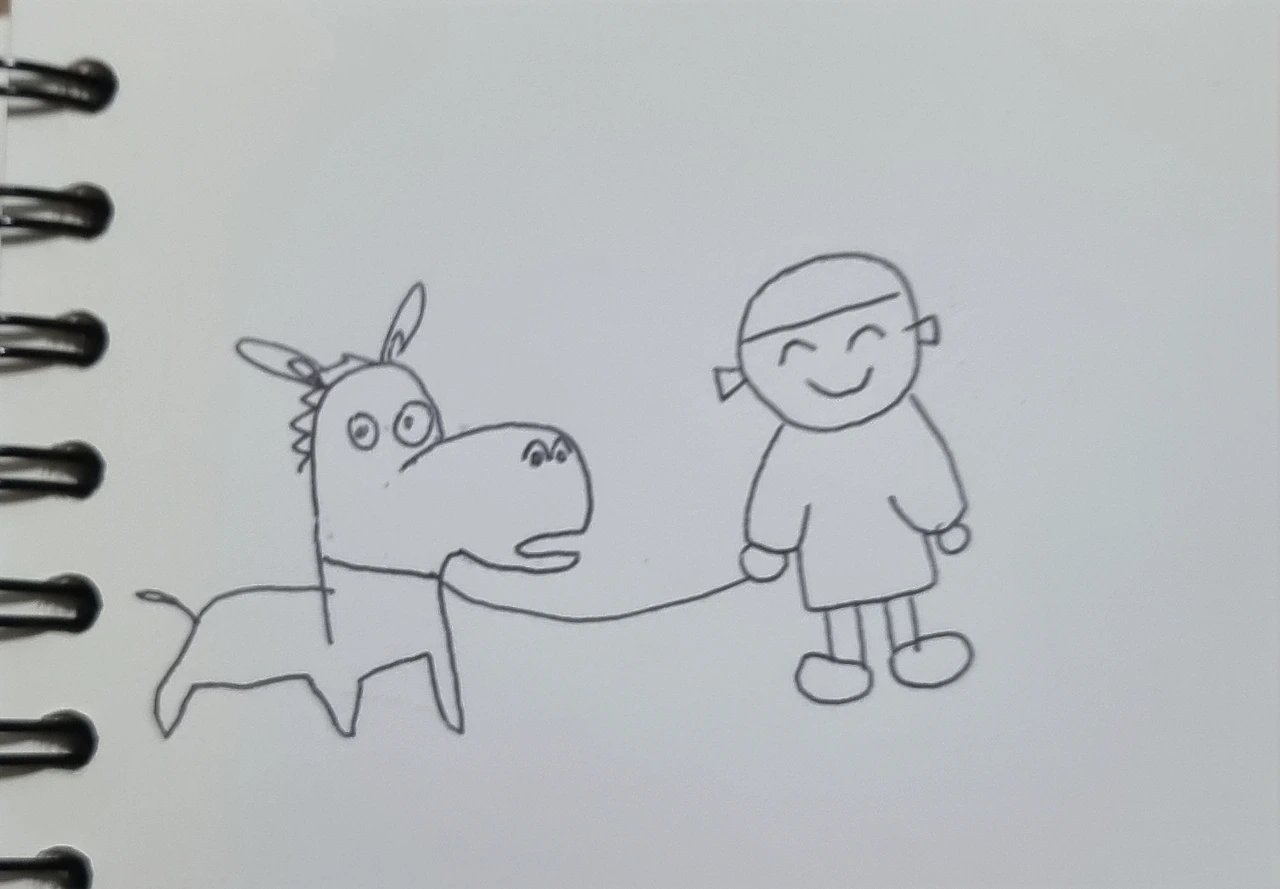 어린아이가 당나귀를 데리고 길을 가는 단순한 내용의 동화였습니다.