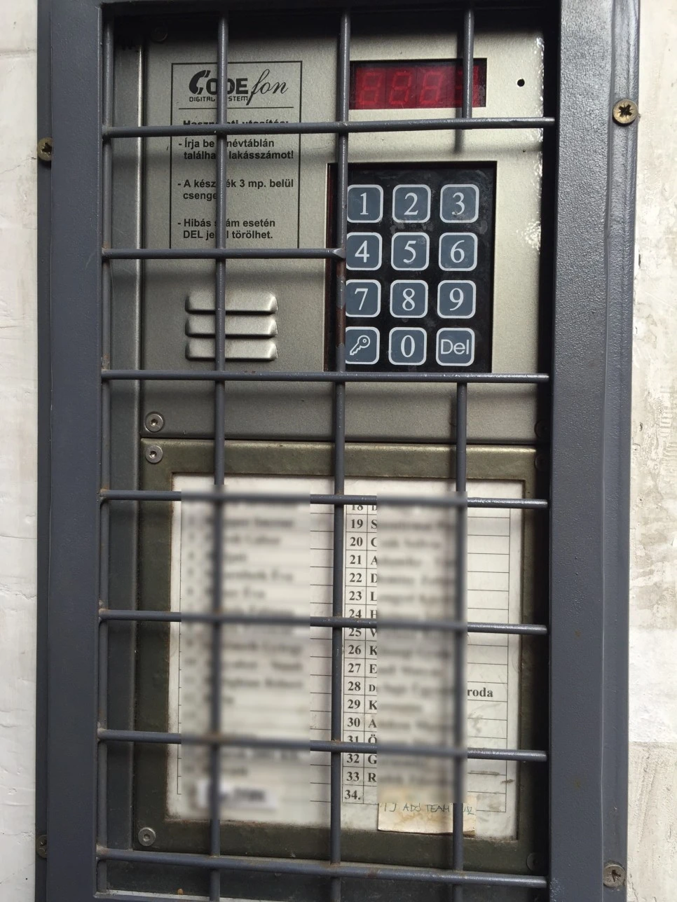 주로 앞번호는 '층'이고, 뒷번호가 호수이다. (헝가리는 우리나라 1층이 '0'층이다. 그라운드 floor 같은 개념) : 집 번호와 열쇠 모양을 누르면 벨이 울린다.