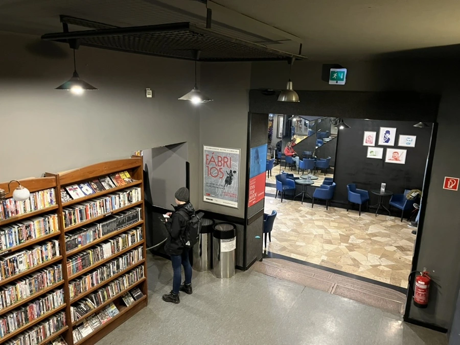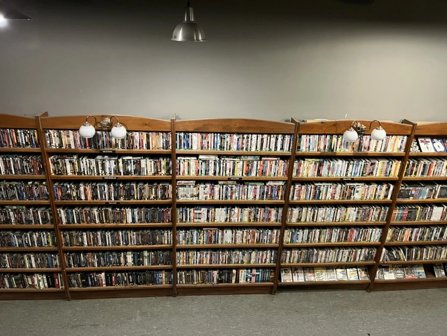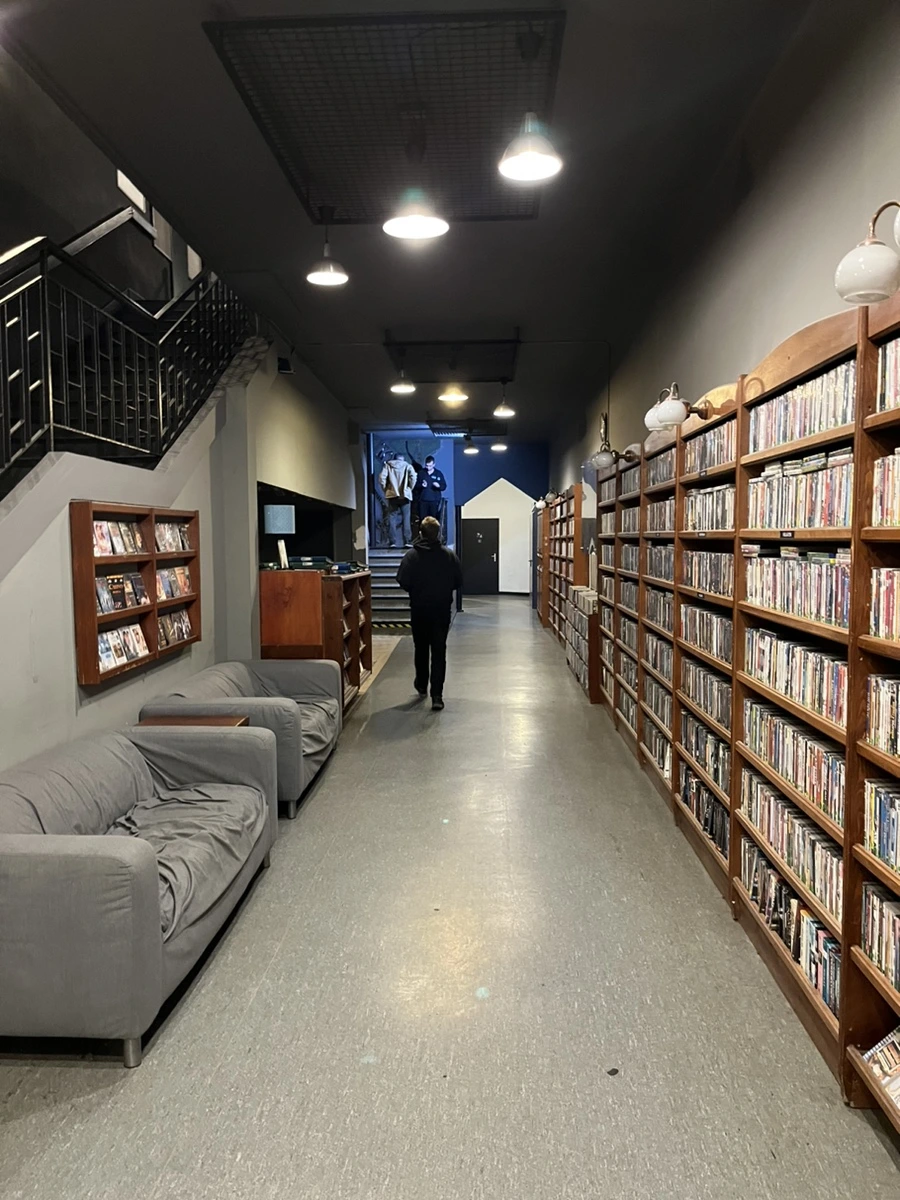 영화관 복도 책장에 영화 CD들이 꽂혀 있다.