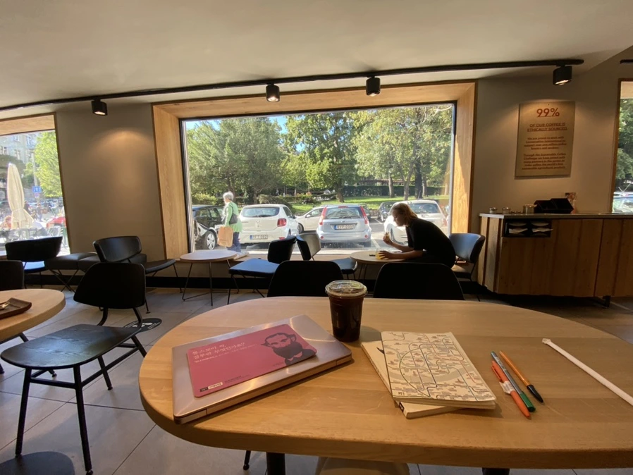 (벽을 등지고, 통창이 눈 앞에 펼쳐져 있어야 하고, 지나가는 이들의 움직임과 표정, 이야기가 들리면)..