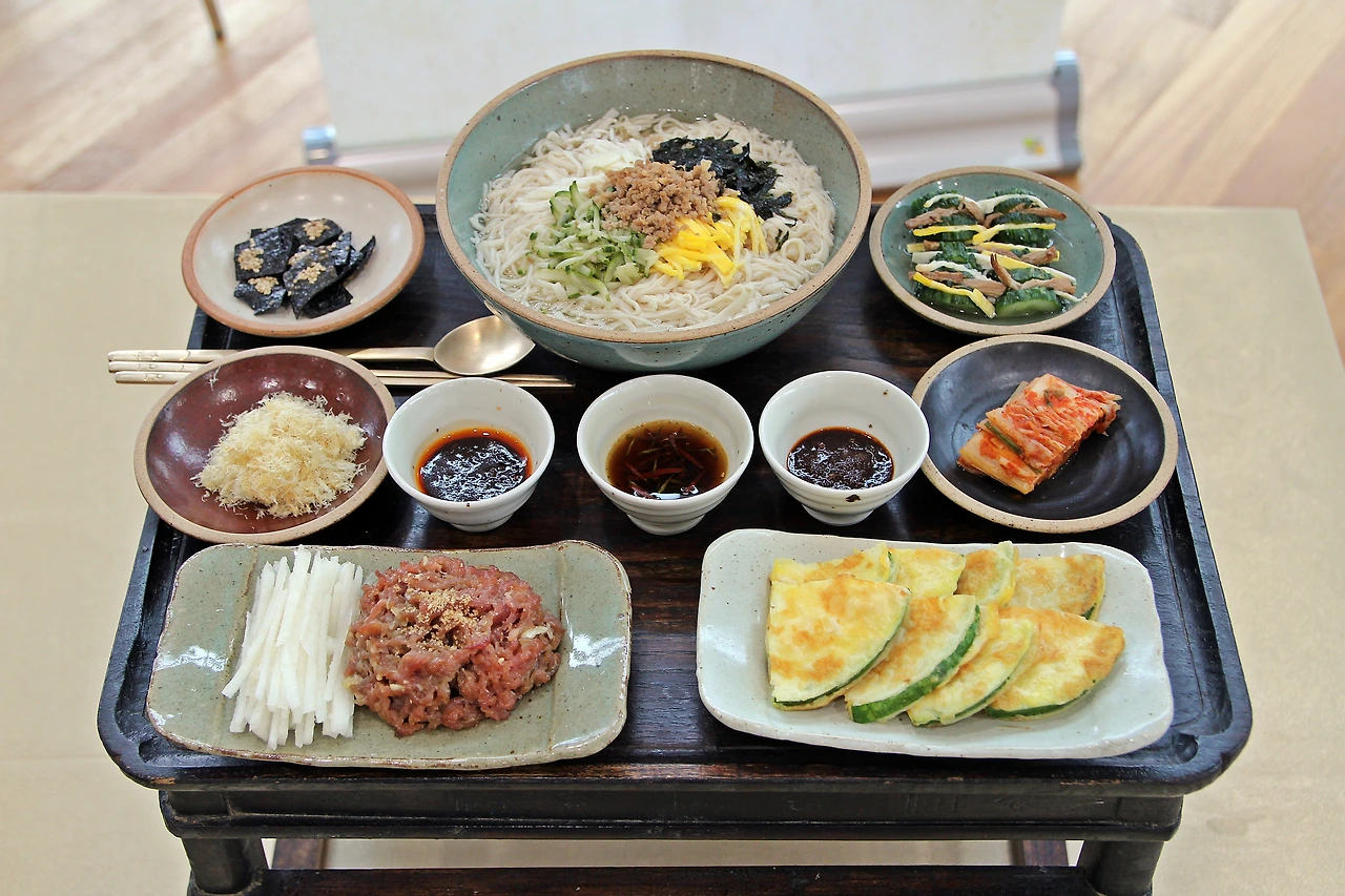 건진국시(국수)는 귀한 손님이 오셨을 때 반상 차리기가 어려울 경우 손님에게 대접하는 상차림이다. 만드는 과정에 정성이 많이 들어가기 때문에 손님들의 만족도가 높다고 한다. 더운 여름에 입맛도 없고 음식을 넘기기도 힘들기 때문에 어른들을 위한 여름철 음식으로 많이 대접하던 음식이라고 한다. 지촌 종가에서는 열량이 낮은 건진국시에 단백질을 보충하기 위해 육회와 애호박돈전, 복어보푸리 등을 함께 곁들였다. 더 옛날에는 육회를 내지 않고 육전말이를 대접하기도 했다고 한다. 지촌 종가는 임하댐 건설로 종택을 옮겨 지례예술촌으로 재탄생시켜 많은 사람들의 발길을 끌고 있다.