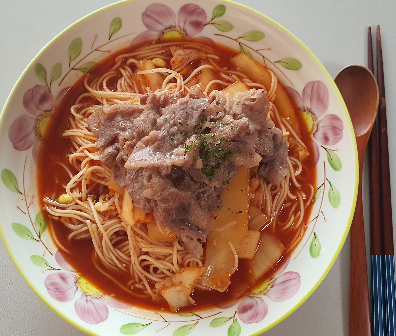 그런데... 요즘 너무 더운 여름이라 그런지 나의 입맛이 도망을 갔나 집밥이 시들해지기 시작했다. 물론 말은 이렇게 해도 매일 밥을 지어먹고는 있다. 하지만 정말 너무나 입맛이 없을 때는 굳이 힘들여 밥 하지 않고 칼칼하게 비빔국수를 만들어 후루룩 넘길 줄도 아는 '유연함'도 생겼다. 비빔국수만으로 속이 좀 허할 때는 얇은 삼겹살을 구워 위에 살짝 올려 먹는다. 비빔국수 면을 삶을 때, 냉장고 안에 콩나물이 보이면 같이 삶는데, 아삭함이 없는 입맛도 살짝 끌어올려주는 역할을 해 주기 때문이다. 이렇게 적어놓고 보니 하루종일 온통 먹는 것만 생각하는 사람 같은데, 그날 메뉴는 될 수 있으면 짧게 고민하고, 냉장고 안을 살펴서 버리는 재료 없이 알뜰히 활용하고 있다. 올해 나의 목표인 '최소한의 소비'를 하면서도, 이렇게 나를 잘 케어하며, 이 더운 여름날을 건강하게 보내고 있는 중이다.
