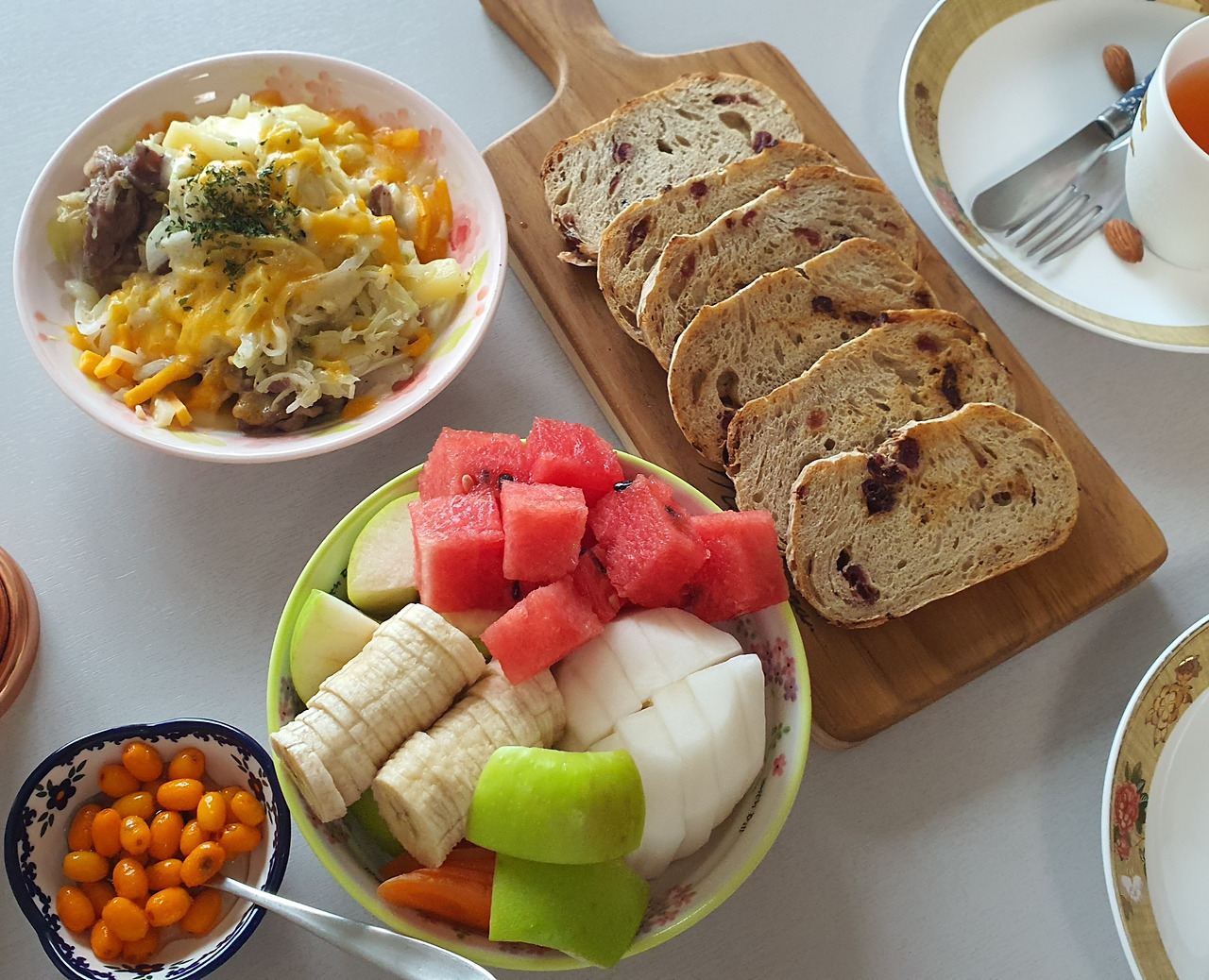 아침에는 주로 빵과 과일, 양배추볶음을 우유나 커피에 해서 같이 먹는다. 별거 없는 것 같지만 달걀이나 고기도 조금씩 첨가해 골고루 먹으려고 최대한 노력을 한다. 냉장고 안에 있는 재료들을 주로 활용하기 때문에 다음 장을 볼 때까지 없으면 없는 데로, 또 있으면 있는 데로 최대한 '냉파' 느낌으로 아침을 차려 먹는다. 잠깐 생각해 보니 아침보다는 '아점'이라고 하는 것이 맞겠다. 맞다! 우리는 하루에 삼시 세끼가 아닌 두 끼만 먹는다. 중간에 간식을 먹고 육체적으로 힘든 일을 하고 있는 것이 아니기 때문에 남들과는 달리 하루에 두 끼만 먹고 지내고 있다. (지금 생각해 보니 하루에 두 끼만 먹으니 집밥을 할 수 있는 힘과 여력이 되는 것 같다.) 이렇게 식사를 하고 나면 하루가 든든하고, 중간에 살짝 간식을 먹으면 저녁을 먹을 때까지 배가 고프거나 힘들지는 않다.