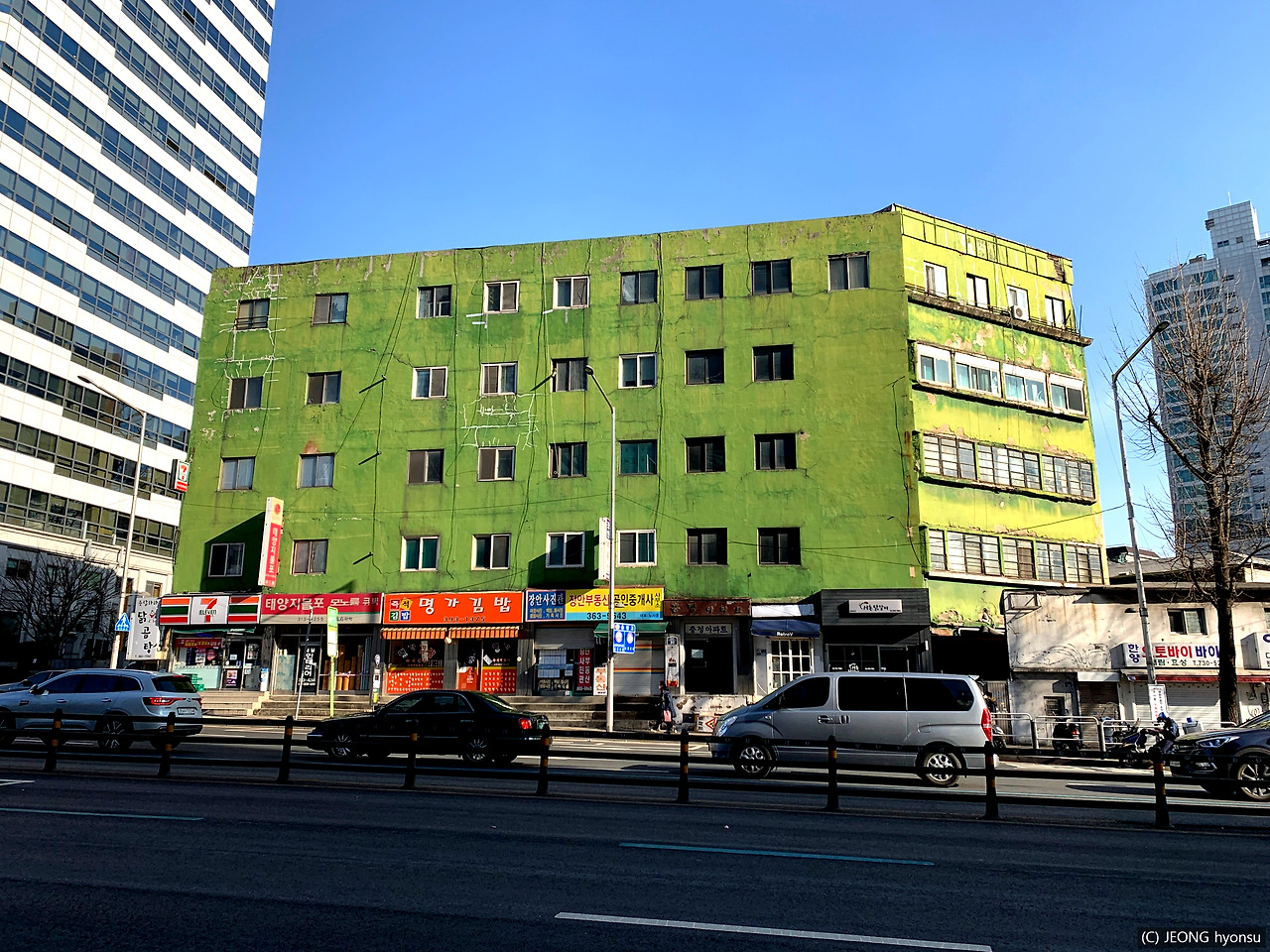 충정아파트를 지나면서 갑자기 든 생각, 저 아파트는 왜관을 왜 초록색으로 마감하였을까? 처음부터 그랬을까 아니면 세월이 흘러 덧입혀진 색일까? 칠이 벗겨진 상황을 보니 덧입힌적도 없고, 원래부터 초록색이었을 것 같긴한데...