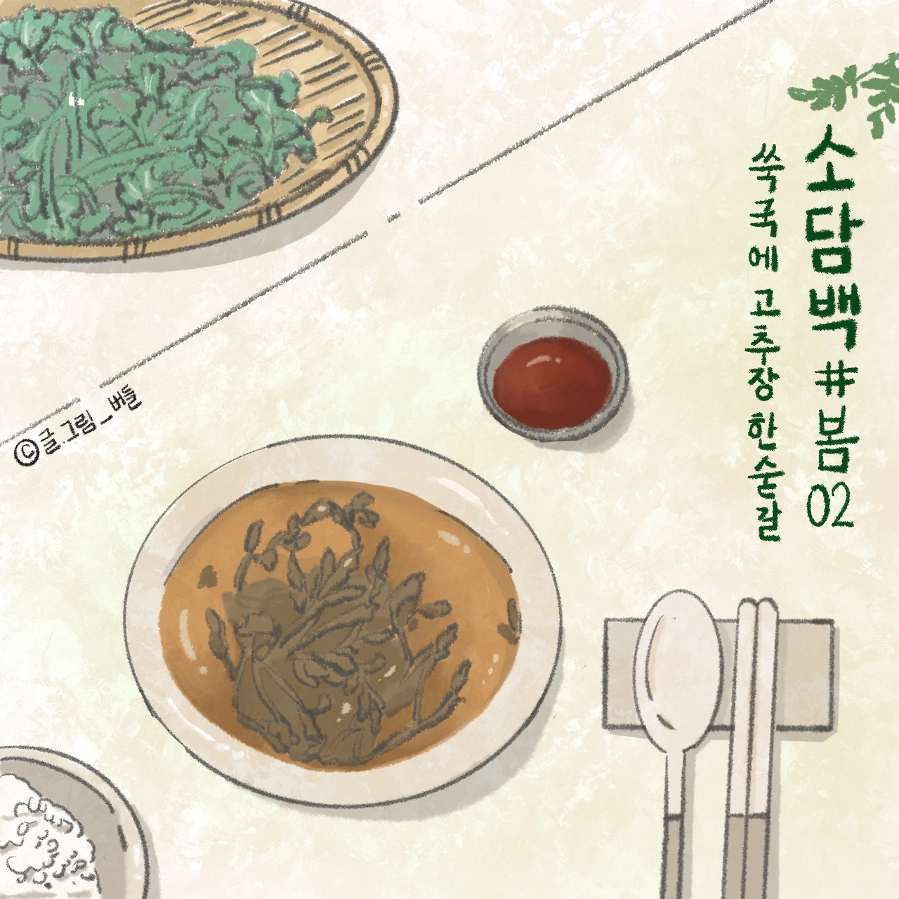 할머니의 걱정스러운 한마디에 고추장 삼분의 일만큼을 덜어낸 뒤, 국그릇에 수저를 담근다. 고추장을 마주한 쑥국이 불그죽죽해졌다.