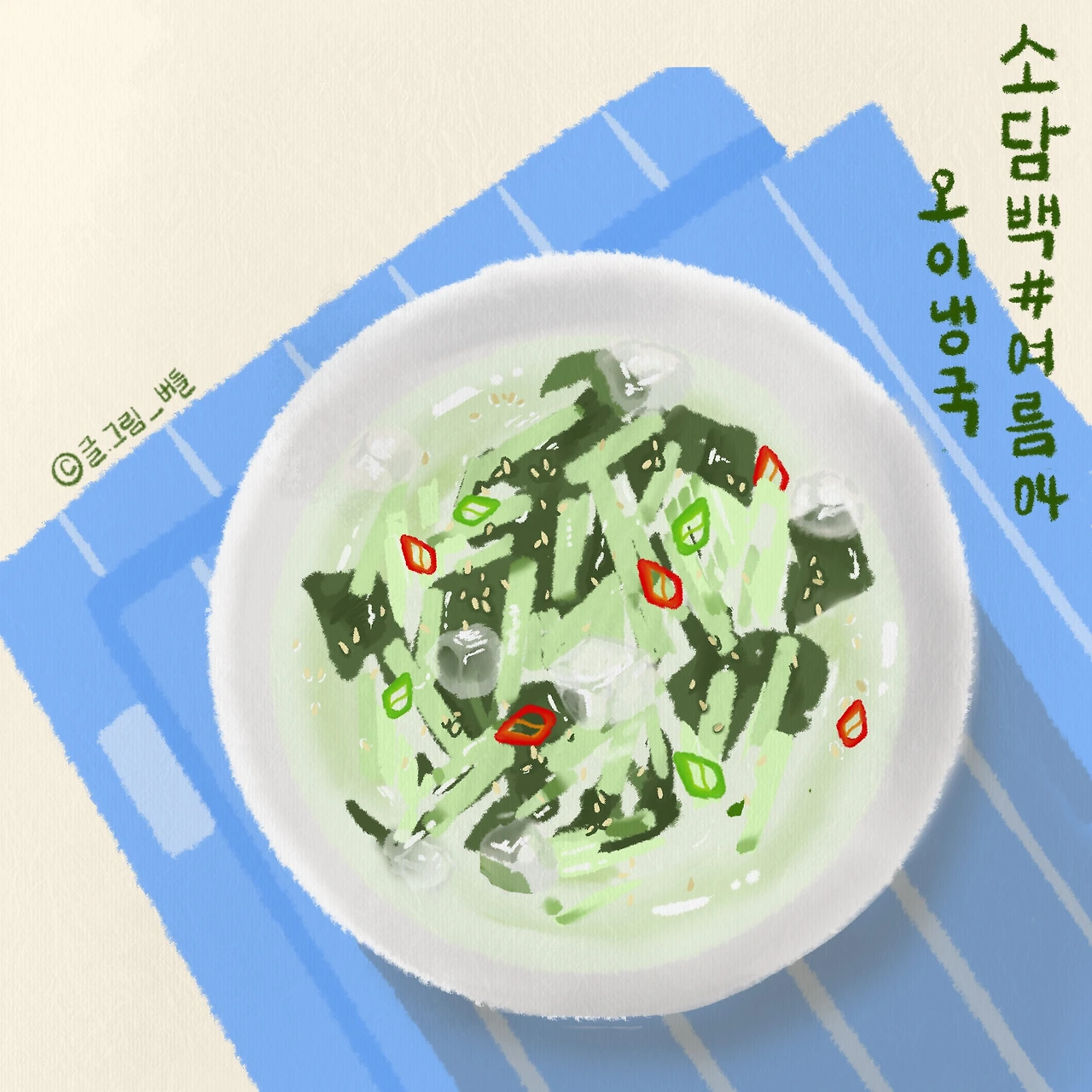 그제야 제대로 된 레시피를 알았지만 그날 이후 오이냉국을 스스로 만드는 일은 없었다. 대신 시원한 오이냉국이 먹고 싶을 때면 엄마에게 전화를 건다. 얼마 뒤 부모님 댁에 가면 얼음 둥둥 띄운 시원한 오이냉국을 맛볼 수 있다.