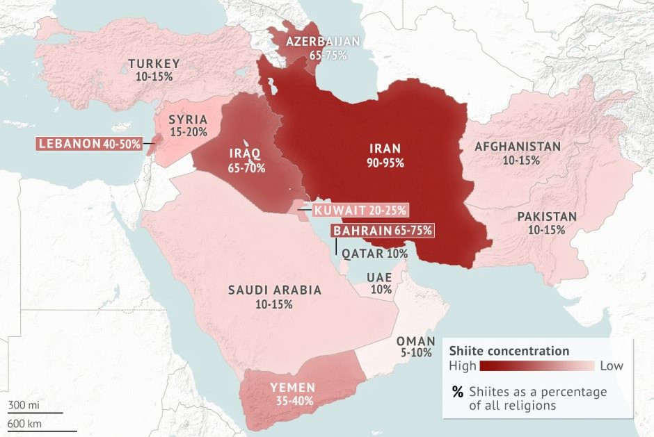 시아파는 이란과 이라크 남부를 중심으로 바레인과 예멘(후티반군), 레바논 일부(헤즈볼라) 등지에 분포한다. 시리아는 국민 대부분이 수니파이지만 시아파가 통치하고, 바레인은 정반대다.