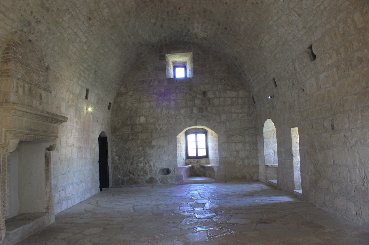 망루 내부도 텅 비어 있는데, 밋밋한 내부에서 그나마 2층 대형홀이 눈길을 끈다. 아마 간부들이 중요한 작전회의를 하거나, 연회를 베풀던 장소였으리라. 지금은 조촐한 벽난로만 있을 뿐인데, 한쪽 면에 뜬금없이 새겨진 조그만 백합문장(fleurs-de-lis)이 눈에 들어온다. 망루 안에 유일한 성화에도 어김없이 이 상징은 반복된다. 그뿐이다. 크로아 파테 하나 없어 조금은 실망했다. 템플기사단 몰락 이후 1313년 성채를 인계받은 구호기사단이 살아남기 위해 템플기사단과의 관계를 부인하고 그들의 흔적을 철저하게 지워버린 탓이다. 그래도 지구상에 남은 템플기사단의 유일한 본부 건물인데, 이 정도 남아 있는 것만으로도 감사해야 하는지 마음이 무거워진다.