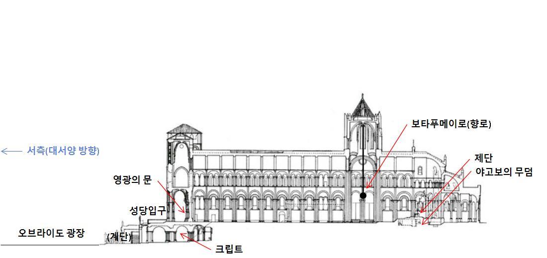광장에 면한 서측 입구에 들어서면 본당으로 들어가기 직전, 유명한 ‘영광의 문’을 지나게 된다. 스페인 로마네스크 조각의 최고 걸작으로 손꼽히는 ‘영광의 문’은 3개의 아치로 구성되었다. 중앙아치는 좌우 아치의 두 배 크기로서 상부의 무게를 견디기 위해 아치 가운데 받침기둥(멀리언)을 두었다. 자연스럽게 화면은 4분할 된다.