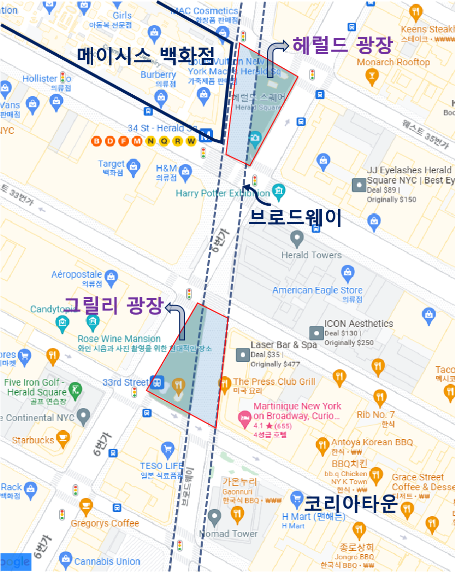 블록의 가장자리와 어중간하게 만나는 브로드웨이는 건물이 들어서기 힘드니 자연스레 광장이 되었다. 뉴욕의 광장들이 도시 곳곳의 예상치 못한 곳에서, 계획적으로 의도했다면 그런 모양으로 만들어지기 힘들었을 다채로운 형태를 띈 이유가 있었던 것이다. 연말이면 카운트다운을 세는 타임 스퀘어나, 영화 <34번가의 기적>에 나오는 메이시스 백화점 옆 헤럴드 광장이 모두 그렇게 만들어졌다.
