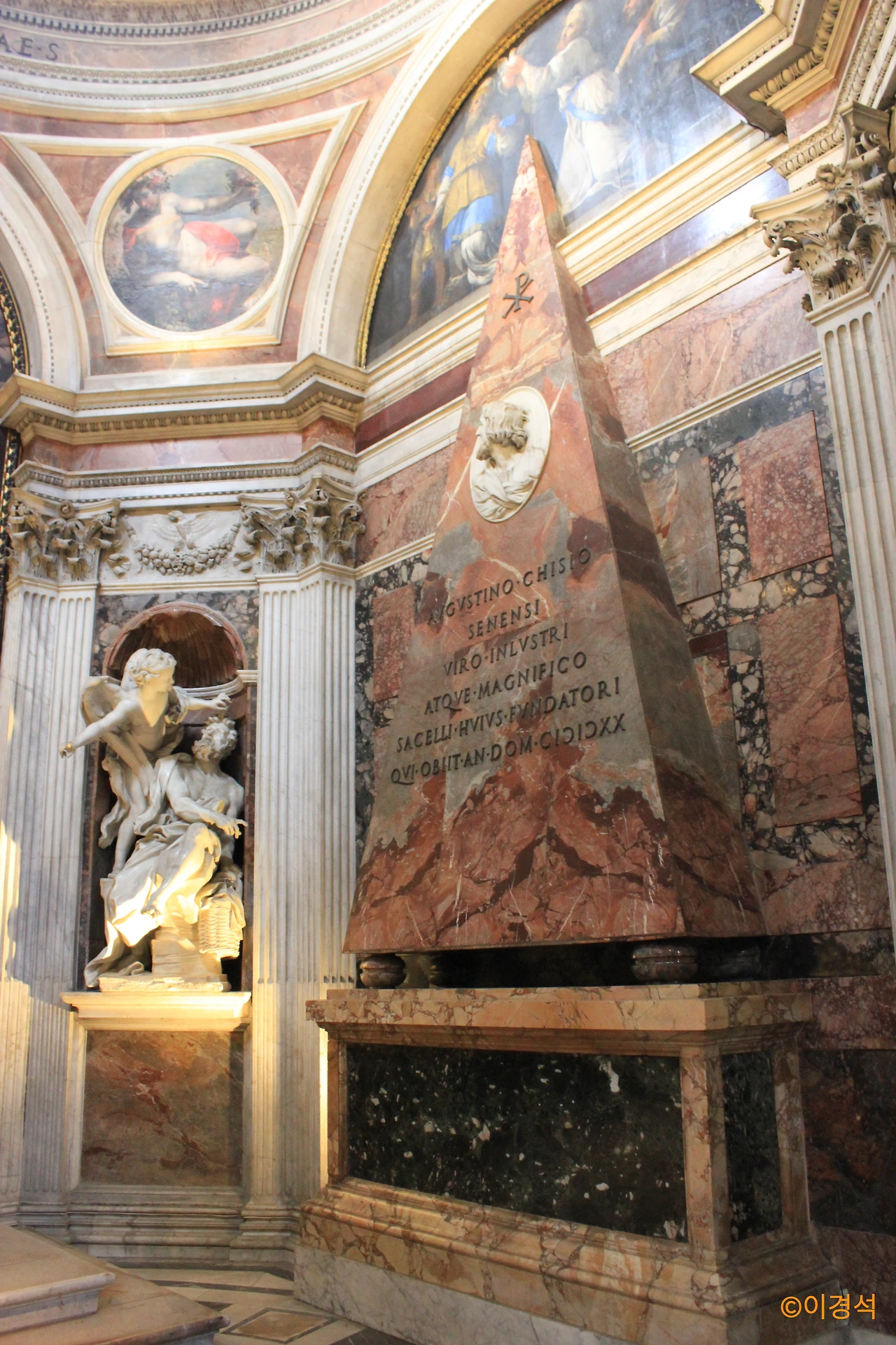 이 채플은 댄브라운의 소설 <천사와 악마> 이후 부쩍 찾는 사람들이 많아졌는데, 소설에서는 ‘지옥의 구멍’에서 첫 번째 희생자가 발생하고 제단 옆에 베르니니가 조각한 <하박국과 천사>는 사건 해결의 중요한 단서가 된다. 하지만 소설은 어디까지나 소설이다. 베르니니를 주인공으로 만들기 위해 이 모든 게 그가 남긴 음모인 것처럼 묘사됐지만, 실제로는 베르니니가 자신을 후원한 키지 가문을 위해 가문의 문장을 디자인의 컨셉으로 사용한 것일 뿐이다.