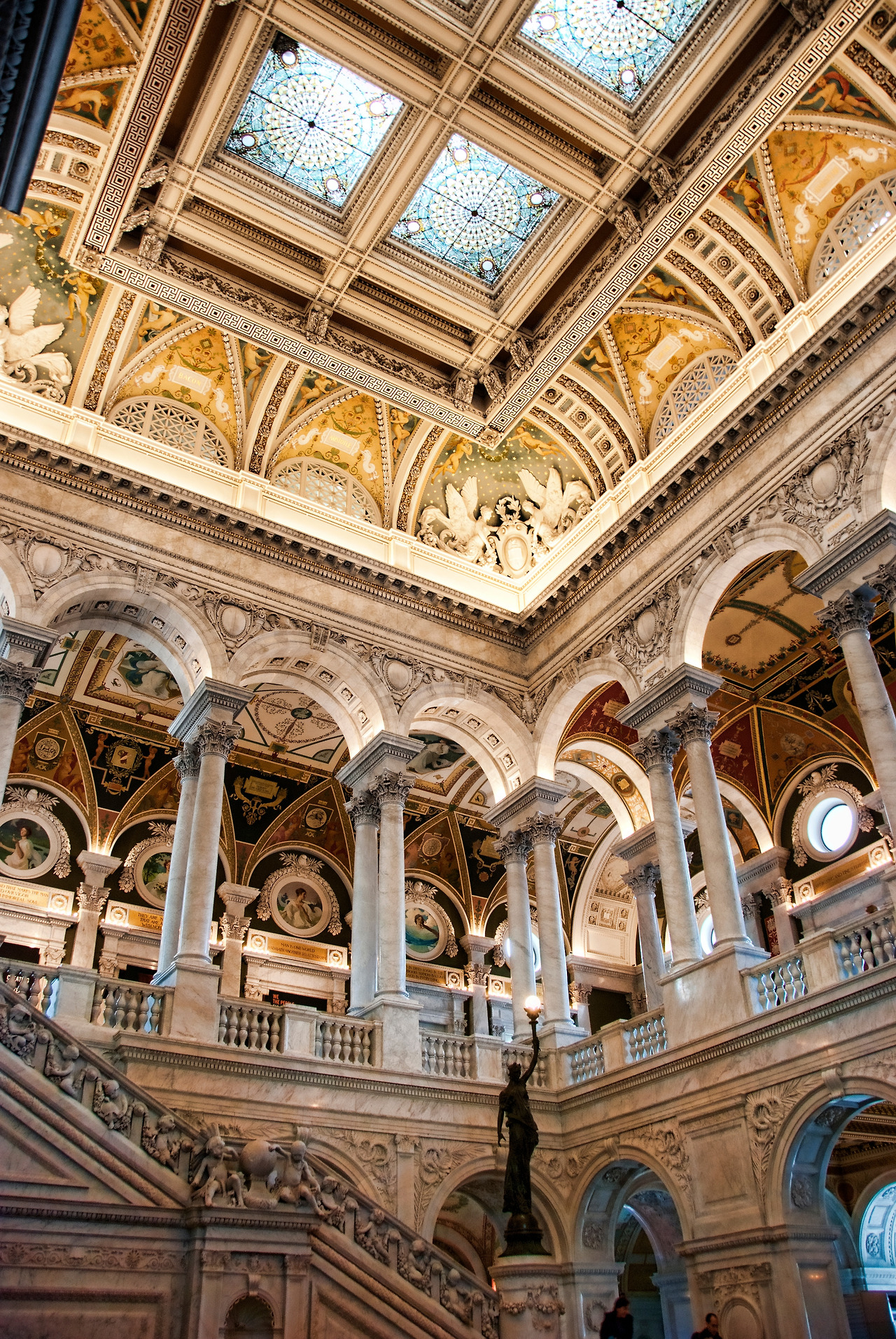 조각과 모자이크로 가득 채워진 벽면과 천장은 단테와 호머같은 인류의 지성들을 기념하고, 그 아래로 쌍을 이룬 기둥들 사이에 수학과 물리학, 화학과 지질학과 같은 학문을 관장하는 여신들이 자리한다. 벽면과 만나는 천장의 모서리에는 솔로몬 신전에 있었을 법한 케루빔 한쌍이 학문과 (계몽을 상징하는) 횃불을 보호한다. 그러고보니 이 횃불을 밖에서도 봤다. ‘지식의 횃불(Flame of Knowledge)’로 명명된 조형물은 건축물의 가장 높은 돔 꼭대기에서 마치 올림픽 성화처럼 활활 타오르고 있다.