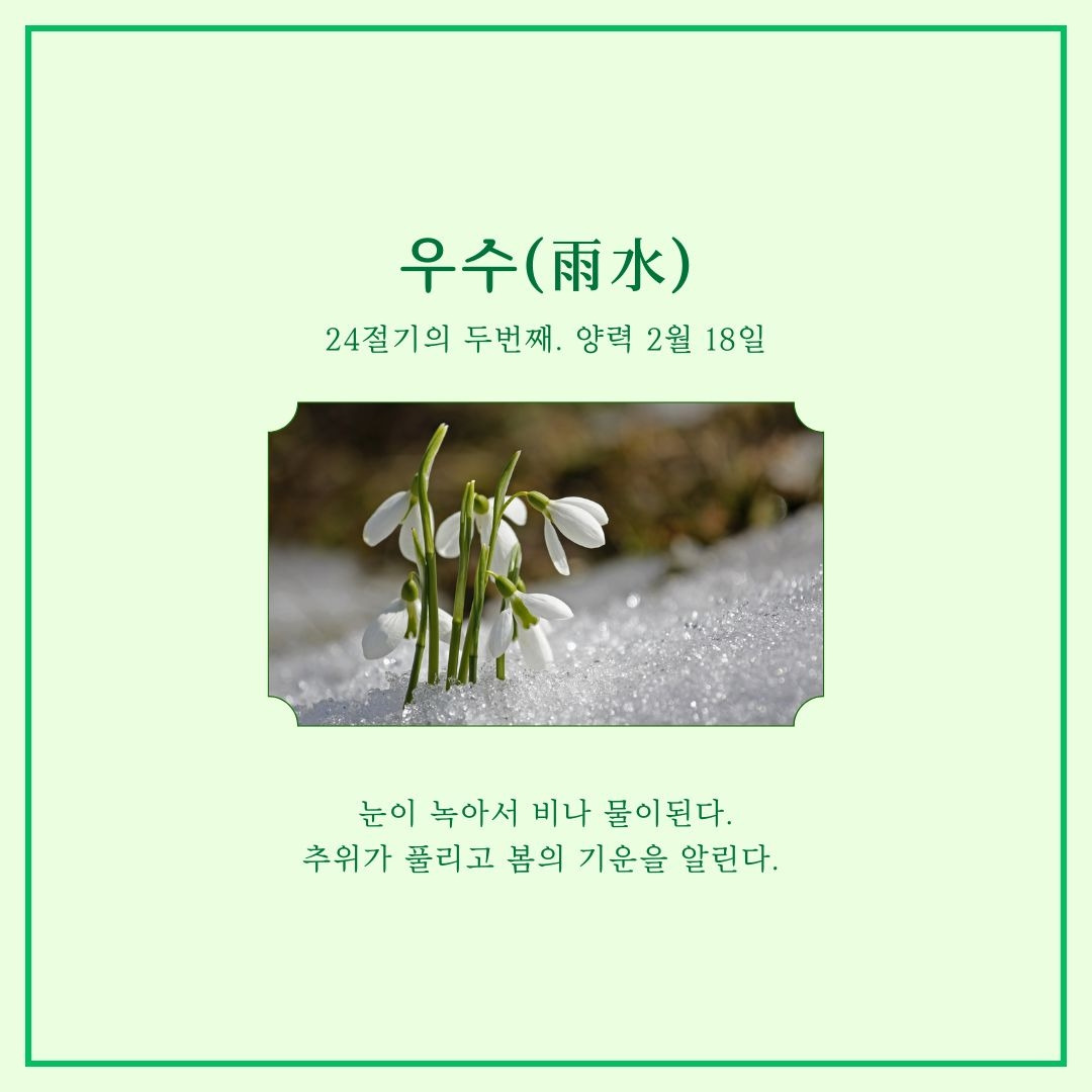 정월 대보름이 지나고 우수(雨水)가 찾아왔다. 우수는 눈이 녹아 비가 된다고 했지만 아직 날씨는 그렇지 못한 듯했다. 영하권의 날씨가 계속 이어지더니 눈이 내리기도 했다. 과학기술이 발달해도 예전같이 날씨를 예측하는 것이 더 어려워진 것이 한 두 해가 아니기에 그리고 우수라고 하여 특별히 준비하는 행사가 있는 것도 아니기에 거의 기억하지 않고 지나는 것 같다. 입춘이 지나고 3월 경칩을 맞이하기 전까지 우수는 그저 기억하지 못하는 하나의 절기인 듯하다.