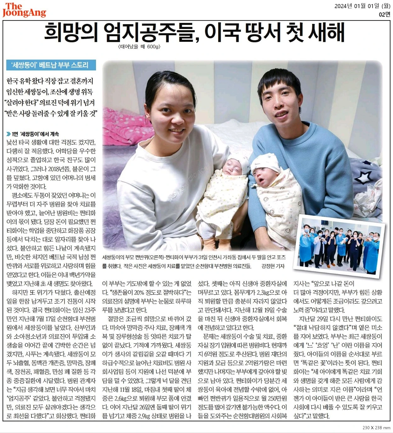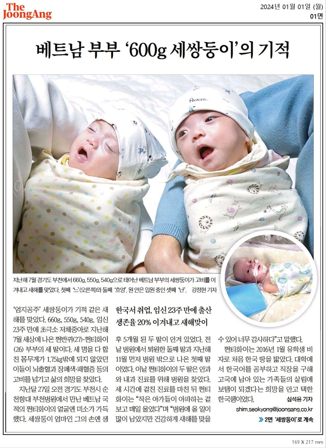 지난해 12월 베트남 이민자 쩐티하이 부부를 만났다. 한국에서 낳은 세쌍둥이가 초미숙아였던 탓에 출산 후 반년이 지나도록 아이들을 품에 안지 못하던 20대 부부였다. 다행히 수술이 무사히 끝났고 후원이 이어지면서 부부는 아이들과 함께 새해를 맞을 수 있게 됐다.