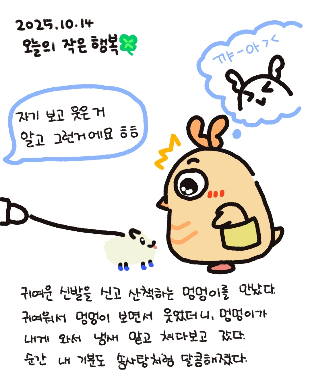 동물을 좋아한다. 강아지를 키우는 분들이 많아서 종종 산책하는 강아지들을 마주하는데, 그날 강아지가 너무 귀여웠다. 신발이 정말 포인트!! 인사해 줘서 기분이 더 좋았다. 하지만.. 그날 이후로 그 강아지를 본 적이 없다ㅠㅠ아쉽다..