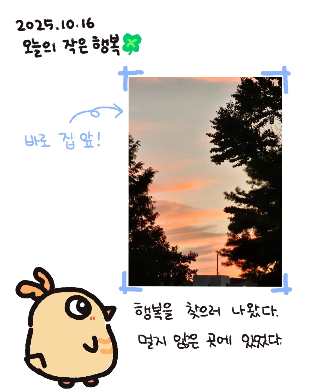 이틀 연속 행복이 떠오르지 않아서 행복을 찾으러 나갔던 날. 주황빛 노을이 너무 예뻐서 한참 바라보고 사진을 찍었다. 이때 조금 깨달은 것 같다. 진짜 작은 행복을 찾는 거였는데, 나도 모르게 큰 행복을 찾고 있던 건 아닌지...