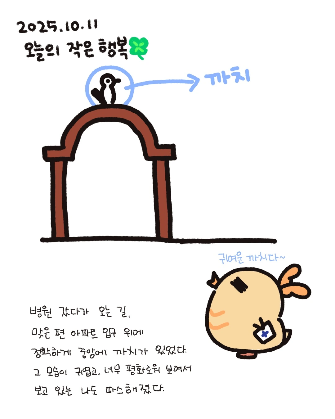 추석 연휴 끝자락 주말에 병원에 갔었다. 주변에 사람들도, 차도 없어서 그 순간엔 까치와 나만 있었던 걸로 기억한다. 한적한 그 분위기가 좋았다.