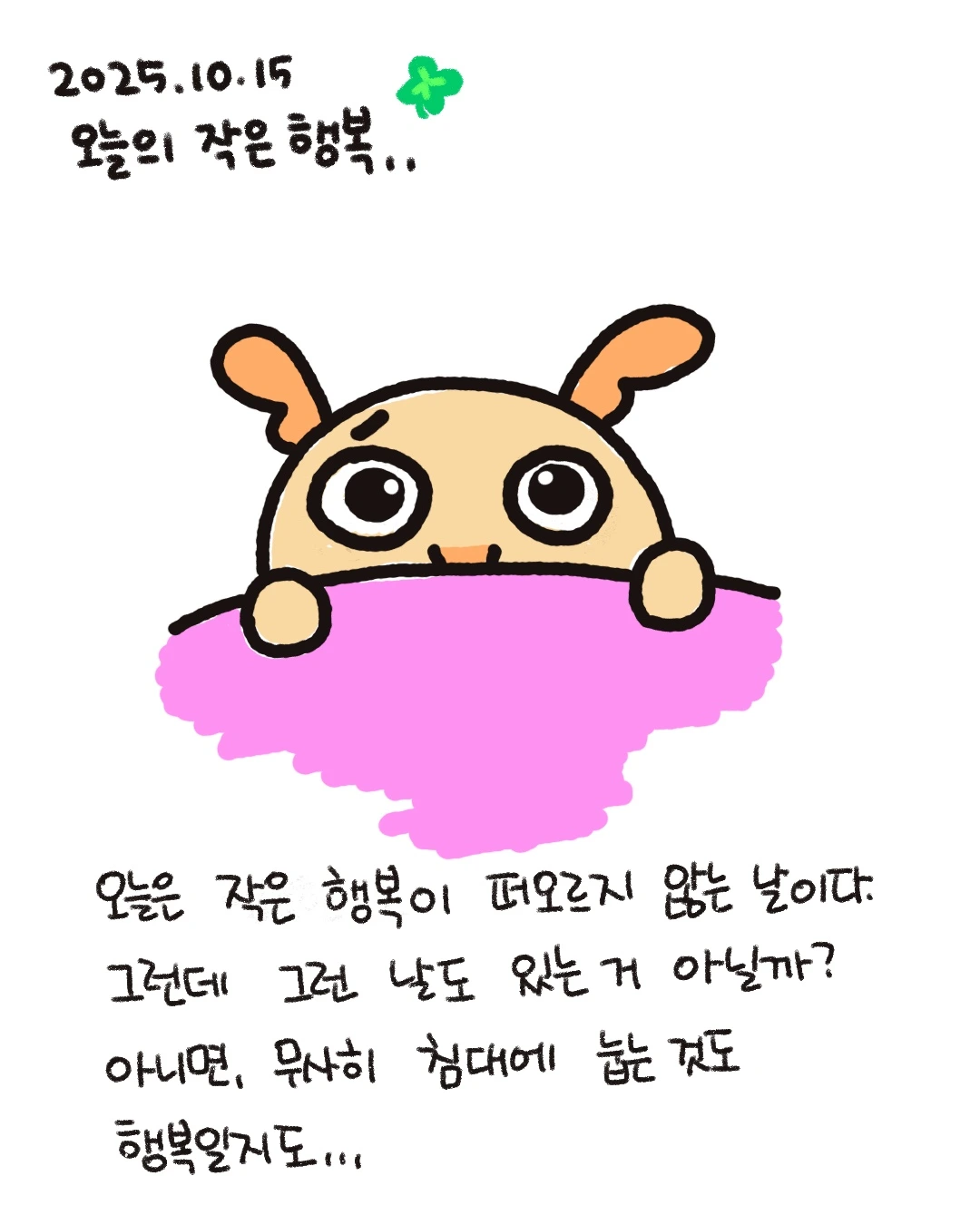 나름 '오늘의 작은 행복'을 쓰기로 다짐(?)하면서 아무리 생각해도 기억나지 않는 날이었다. 그래서 그냥 생각난 대로 썼던 걸로 기억한다. 지금 생각해 보면 포근한 침대에 눕는 것도 내겐 행복이었다.