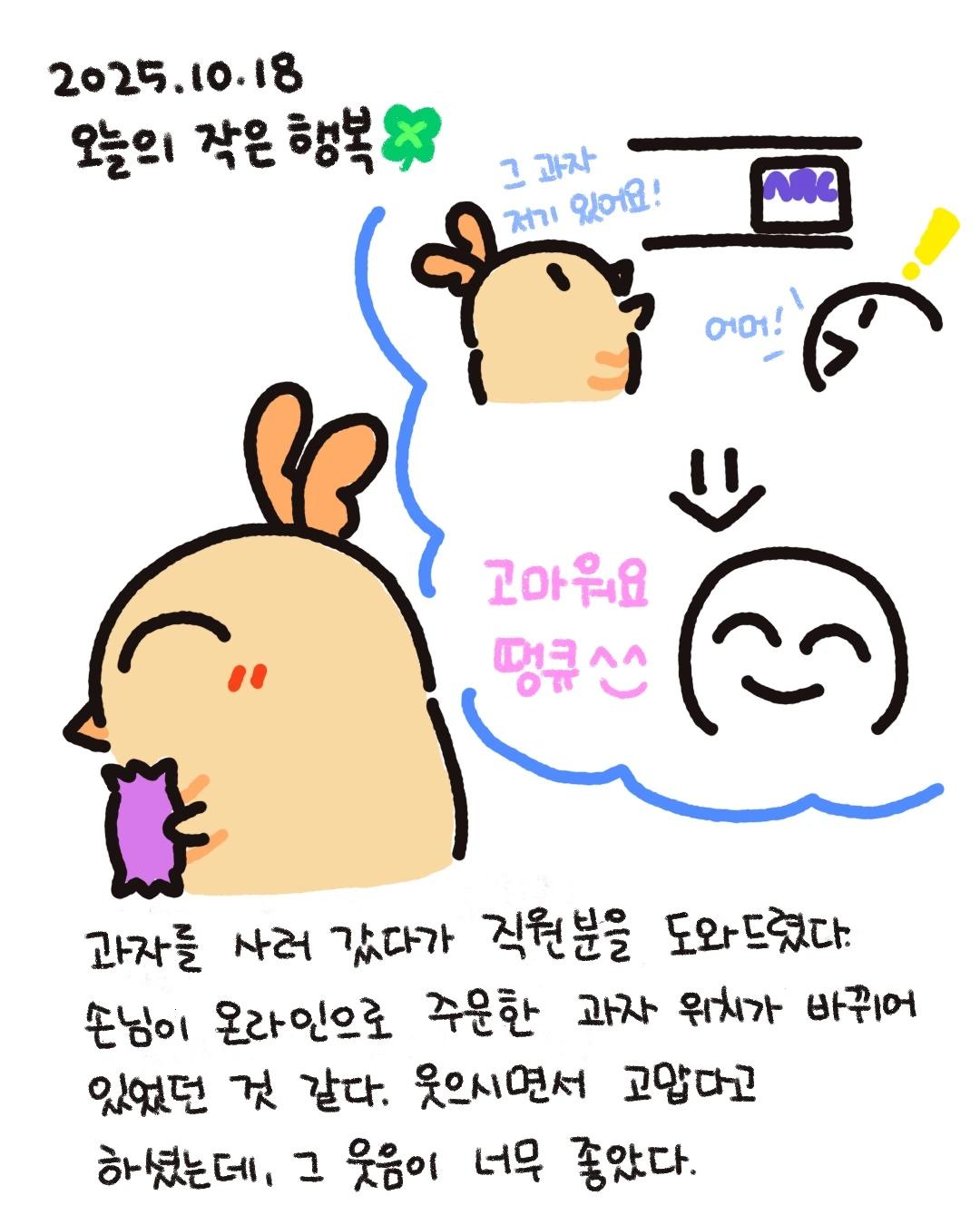 그 직원분이 정말 너무 밝게 웃어주셨다. 사실 그날 피곤하기도 해서 나의 표정은 무표정이었을 텐데, 그분이 그렇게 웃어주셔서 집 가는 길에 나도 배시시 웃었던 걸로 기억한다. 도와드리길 너무 잘했다는 생각이 들었다.