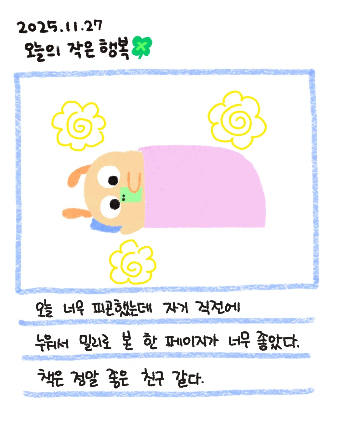 연말이어서 그런가, 피곤함이 매일매일 쌓이는 기분이다. 이 날도 그런 날이었는데 그럴 땐 과감하게 일찍 잠들려고 한다. 그런데 막상 누우면 아쉽고..그래서 밀리를 봤는데, 그 한 페이지가 너무 좋았다. 역시 책은 좋은 친구다.