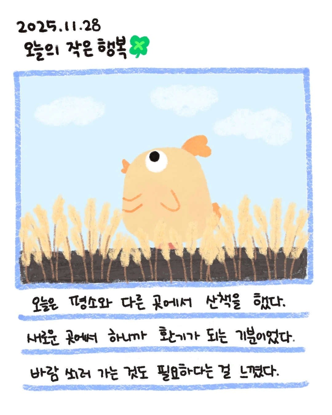 이 날은 바닷가 근처에서 산책을 했다. 똑같은 산책인데도 새로운 곳에서 하니까 느낌이 달랐다. 이래서 다들 한 번씩 여행을 가거나, 바람을 쐬러 가는가 보다. 피곤함이 쌓이는 하루하루이지만 그 순간만큼은 좋았다. 우리 집 앞이 아니라는 게 조금 아쉬웠지만 말이다.