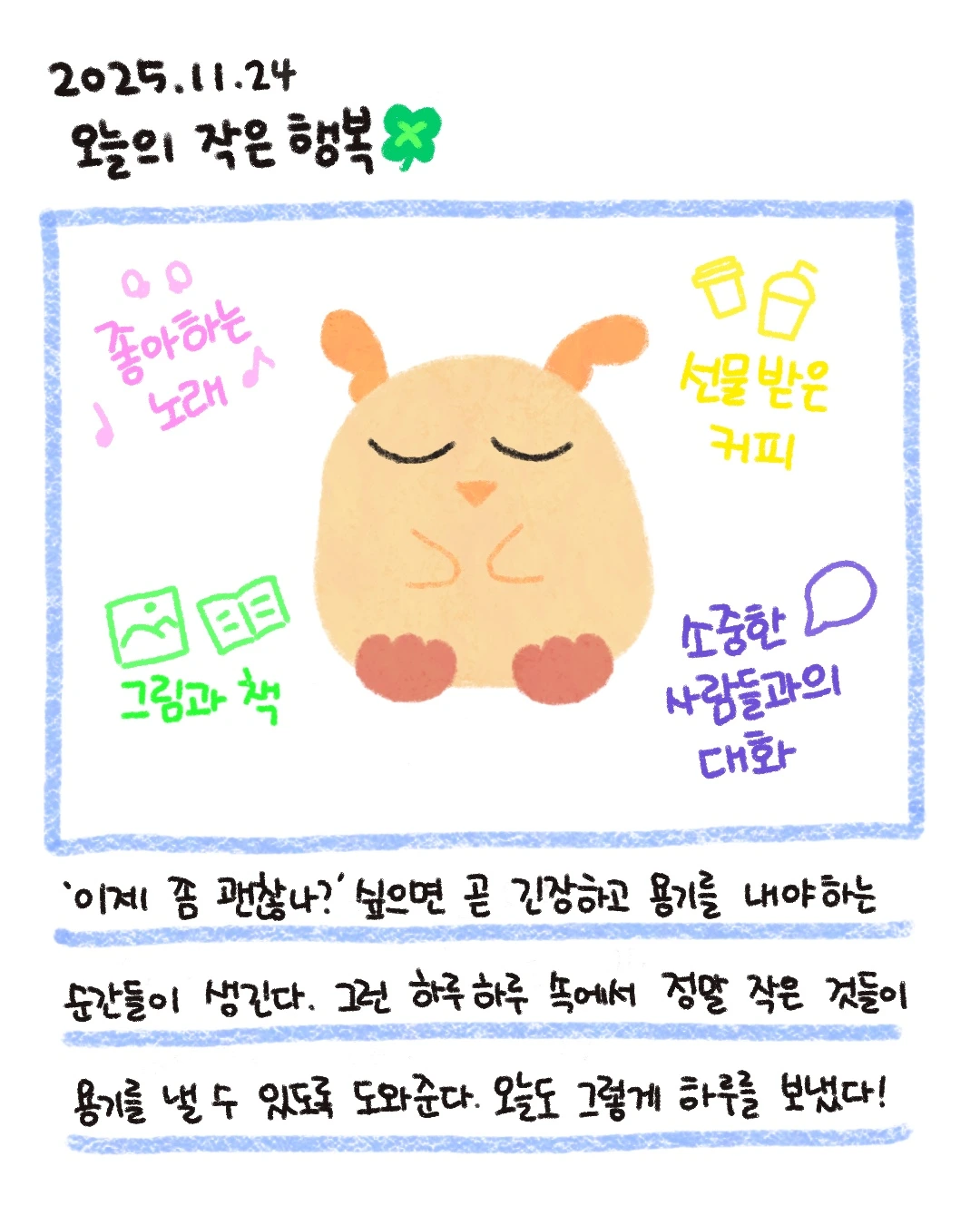 그런 순간들이 있다. 이제 좀 괜찮겠지 싶으면 '어림없지!'하고 바로 긴장해야 하는 순간이 생긴다. 그래서 걱정을 하곤 하는데, 정말 일상의 작은 것들이 숨 쉬게 해 준다. 그래서 너무 고맙고, 그 작은 일상을 내가 느낄 수 있어 행복하다.