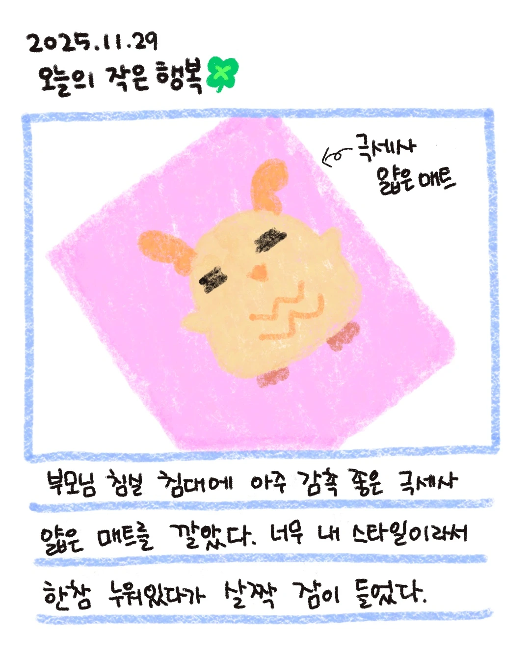내가 쓰는 침대와 부모님 침실에 있는 침대는 조금 다르다. 일단 매트리스가 다르고, 깔려있는 매트도 다르다. 그리고 크기도 다르다. 잠깐이지만, 부모님 침실에 누워서 휴식을 가졌다. 부드럽고 넓어서 양팔을 뻗어 기지개도 켰다가 살짝 잠이 들었다. 부드럽고 넓은 침대만으로도 그 하루가 충분히 행복해질 수 있다는 걸 알았다.