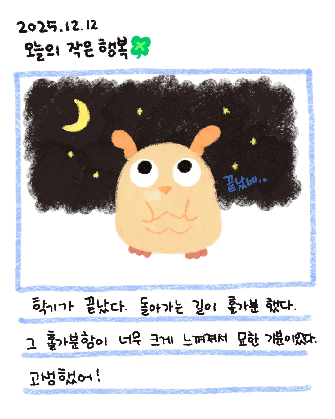오늘로 한 학기가 끝났다. 시간이 너무 빠르다. 1년이 이렇게 흘러갔다. 지하철 타고 돌아가는 길에 마음이 너무너무 홀가분했다. 가볍고, 마음에 무거운 짐이 덜어진 기분이었다. 이렇게 홀가분하다고? 거의 처음 느껴보는 기분이어서 신기하면서도 내가 너무 신경 쓰고 있었나?라는 생각도 동시에 들었다. 1년 동안 고생했어! 이 날, 완전 꿀잠을 잤다.
