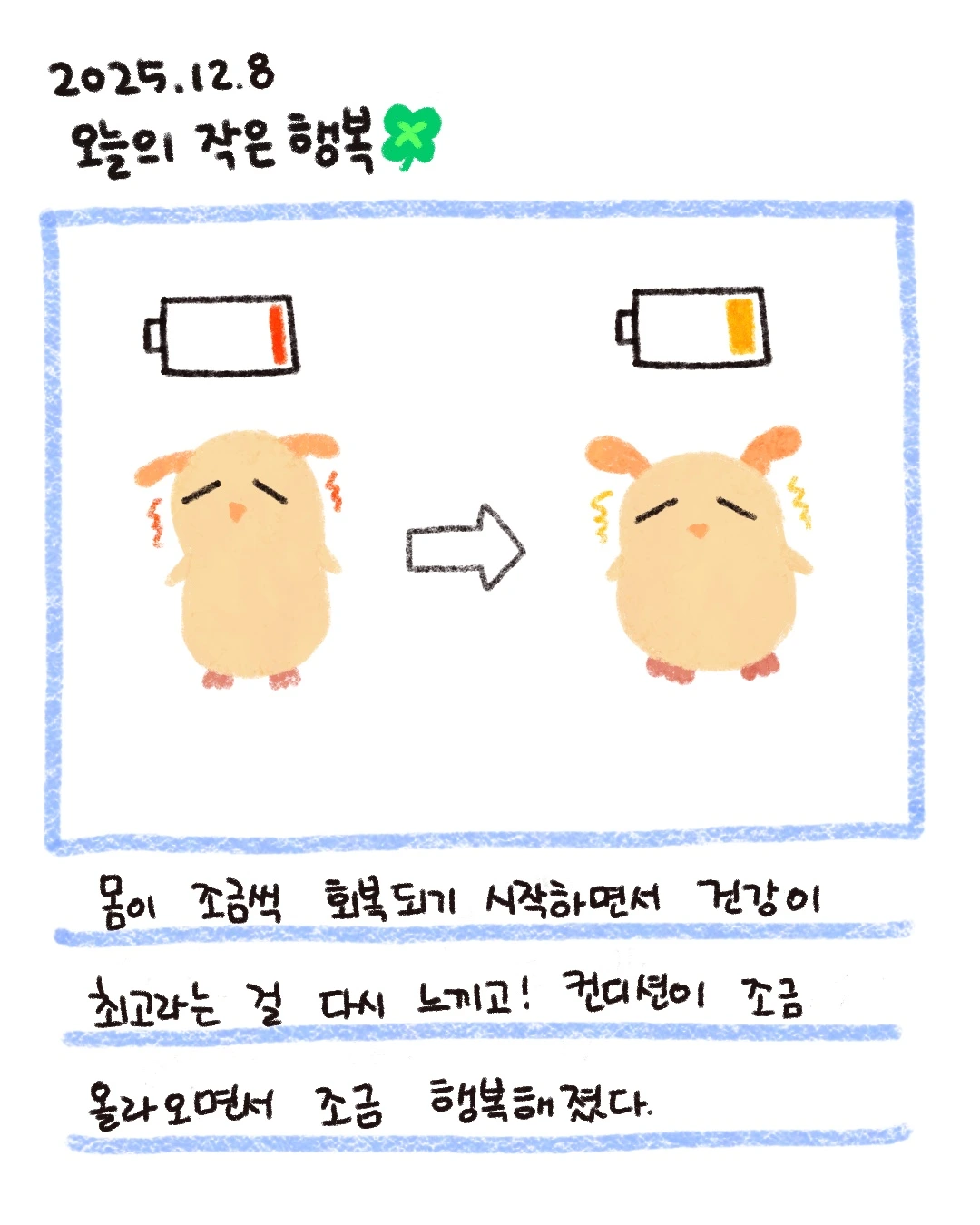 정말, 기운이 없어서 어지러운 느낌은 처음 겪어본 것 같다. 그 이후로 조금씩 아주 조금씩 회복이 되는 게 느껴졌다. 정말 건강이 최고라는 걸 느끼면서 몸이 회복되는 것에 행복했다.
