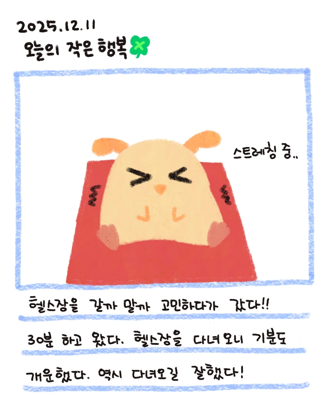 아프고 나서 한동안 못 가다가, 다시 헬스장을 갔다. 딱 30분. 들어가자마자 시간 확인하고 딱 30분 하고 왔다. 안 그래도 뻣뻣한 몸, 스트레칭이 더 힘들었다. 하지만 30분 하고 집으로 가는 길은 뿌듯함에 개운함까지 더해져서 만족스러웠다. 30분이라도 하고 온 게 어디야~~ 오늘도 운동했다! 하면서 집으로 갔다.