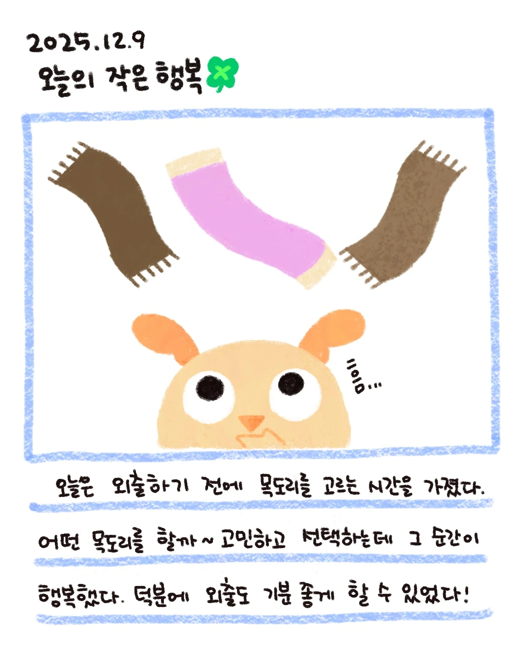 집에서 골골하다가, 잠깐 집 앞에 나갈 일이 생겼는데 날이 추워져서 목도리를 하고 나가야겠다 생각했다. 옷장에서 어떤 목도리를 하고 갈까, 고민하는데 이상하게 그 순간의 목도리를 선택하는 고민의 시간이 설레면서 행복했다. 선물 받은 목도리라서 그런 걸까, 몸이 회복되면서 나가는 외출이라 그런 걸까, 그 짧은 순간이 행복했다. 그래서 어떤 목도리를 선택했냐면....!