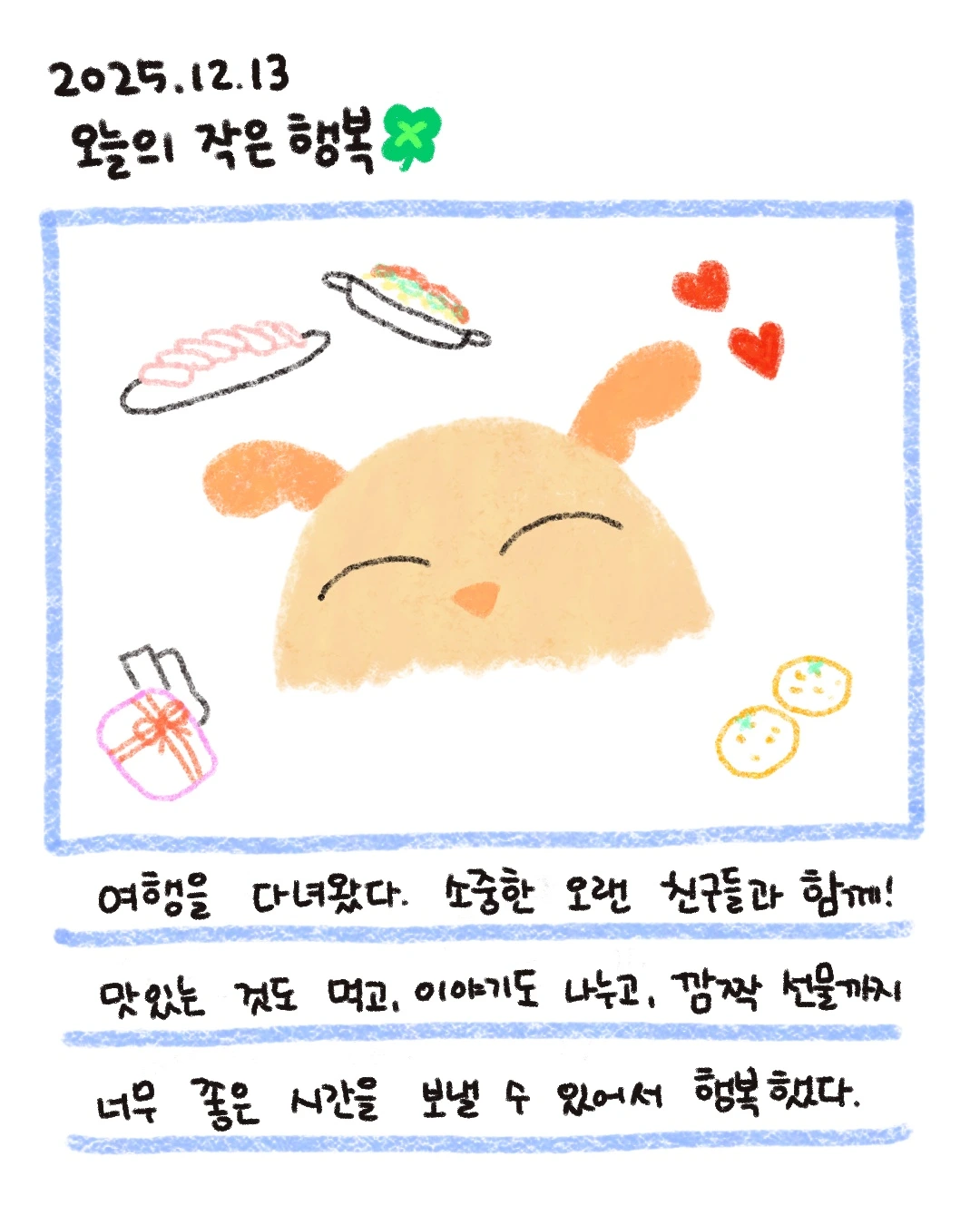 학기도 끝나고, 바로 다음 날! 친구들과 여행을 갔다. 같이 맛있는 것도 먹고, 이야기도 하고, 그냥 말없이 쉬기도 하는 그런 시간들이 너무나 좋았다. 생각지도 못한 깜짝 선물도 받아서 그저 고마울 뿐이었다. 난 준비한 게 없었는데, 이렇게 나의 행복을 채워주는 소중한 친구들에게 고맙고 또 고맙다.